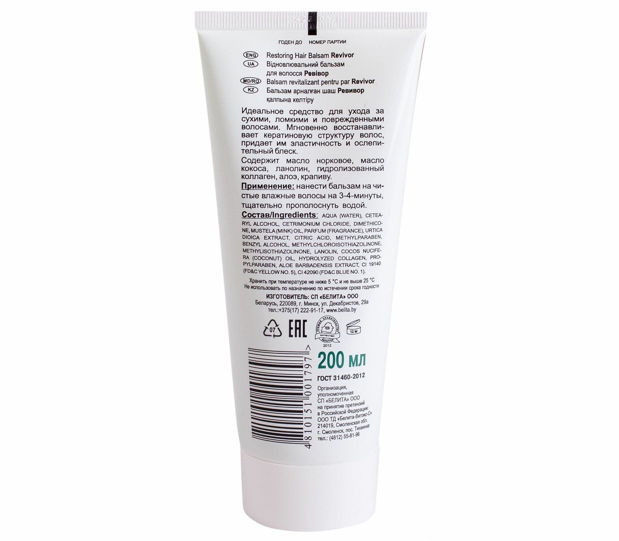 | Способ применения | нанести бальзам на чистые влажные волосы на 3-4 минуты, тщательно прополоснуть водой |