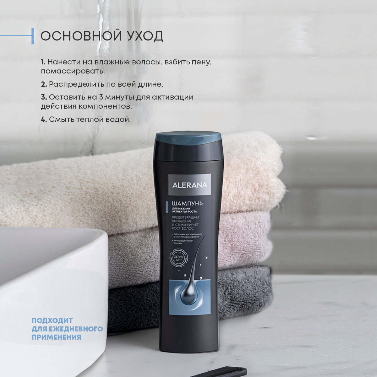 | Способ применения | небольшое количество шампуня нанести на влажные волосы, взбить пену, помассировать оставить на 1 - 3 минуты, затем смыть теплой водой. Подходит для частого использования. Для достижения максимального эффекта рекомендуется использовать шампунь в комплексе с другими средствами ALERANA® |