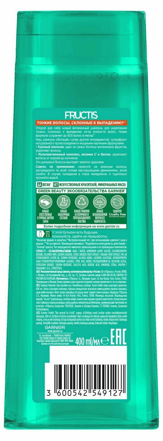 Укрепляющий шампунь Фруктис Рост во всю Силу Красный Апельсин, для тонких волос, склонных к выпадению, 400 мл