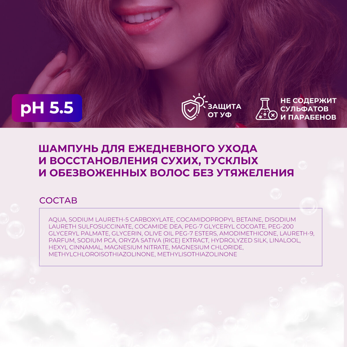 | Состав | Aqua, Sodium Laureth-5 Carboxylate, Cocamidopropyl Betaine, Disodium Laureth Sulfosuccinate, Cocamide DEA, PEG-7 Glyceryl Cocoate, PEG-200 Glyceryl Palmate, Glycerin, Olive Oil PEG-7 Esters, Amodimethicone, Laureth-9, Parfum, Sodium PCA, Oryza Sativa (Rice) Extract, Hydrolyzed Silk, Linalool, Hexyl Cinnamal, Magnesium nitrate, Magnesium chloride, Methylchloroisothiazolinone, Methylisothiazolinone |