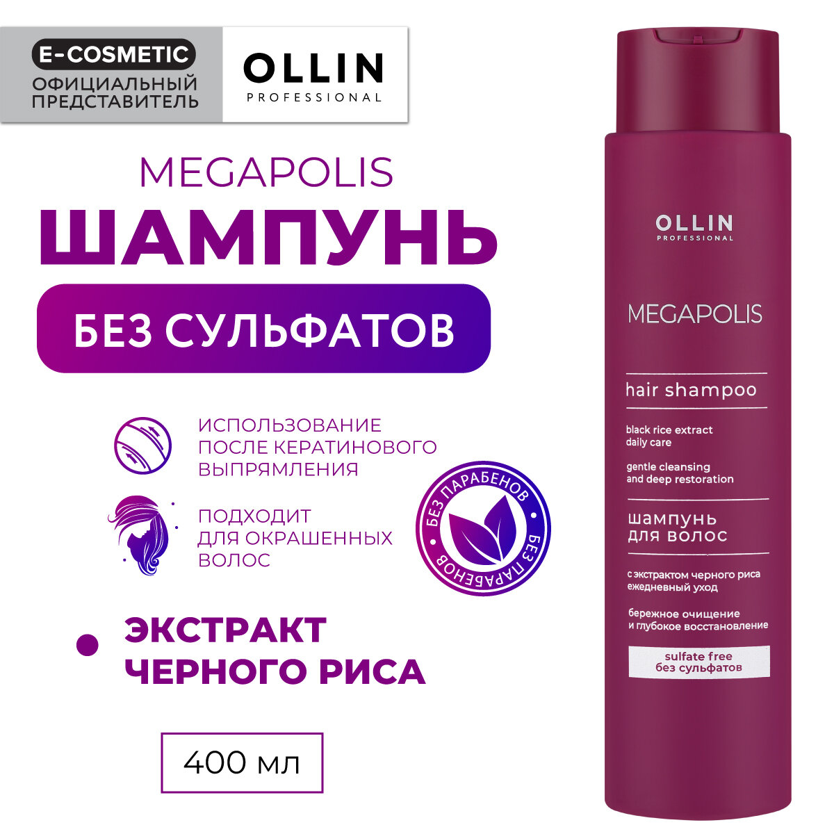 OLLIN / MEGAPOLIS – Шампунь на основе черного риса (без сульфатов и парабенов), 200мл