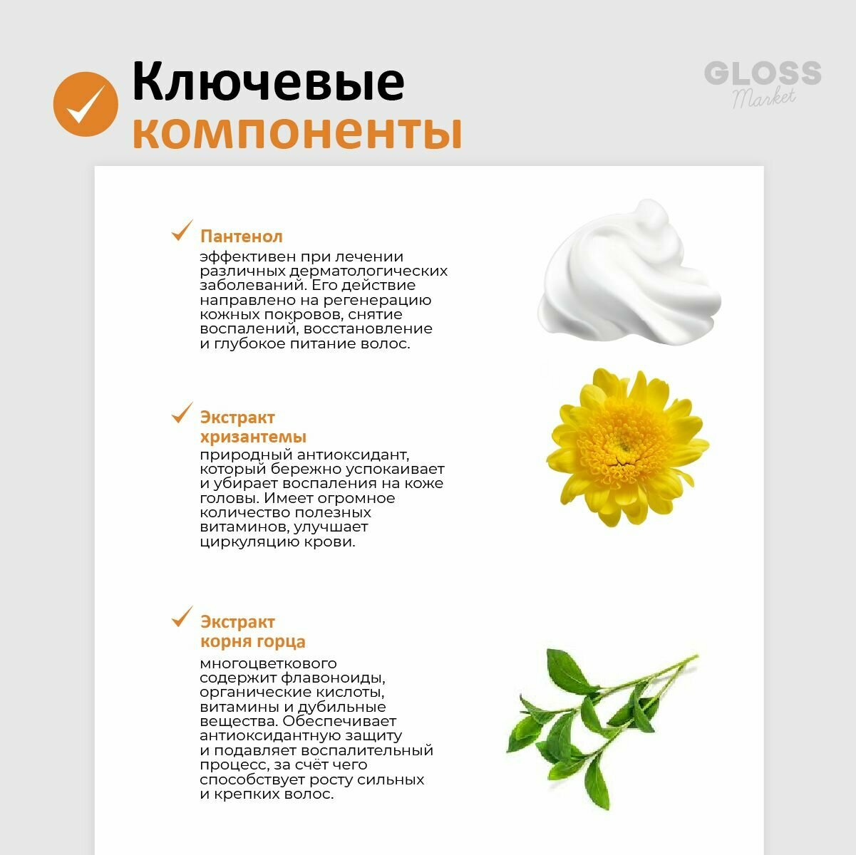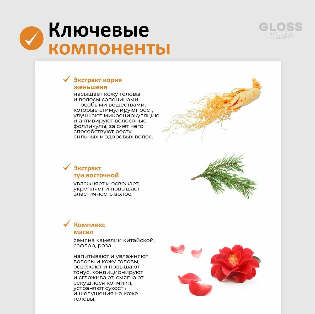 | Эффект | активация роста / восстановление / облегчение расчесывания / очищение / питание / придание объема / придание эластичности / против выпадения / против перхоти / увлажнение / укрепление / успокаивающий |