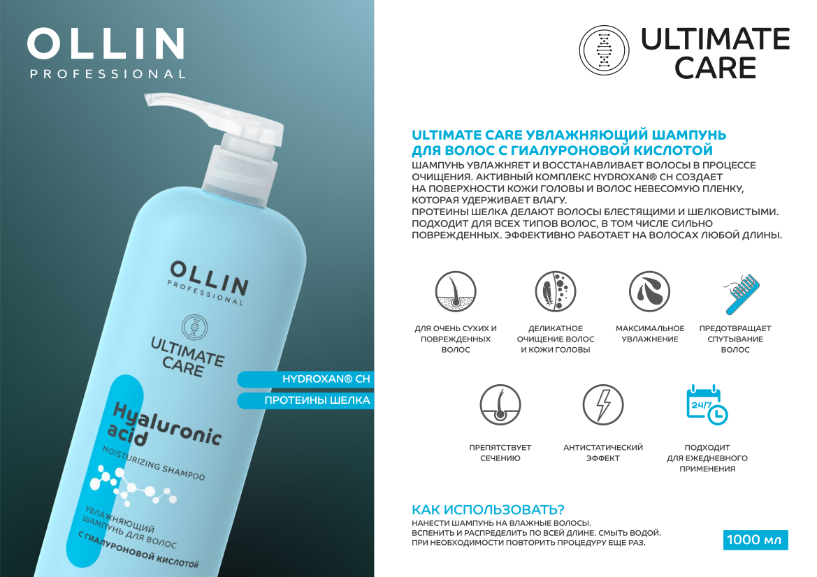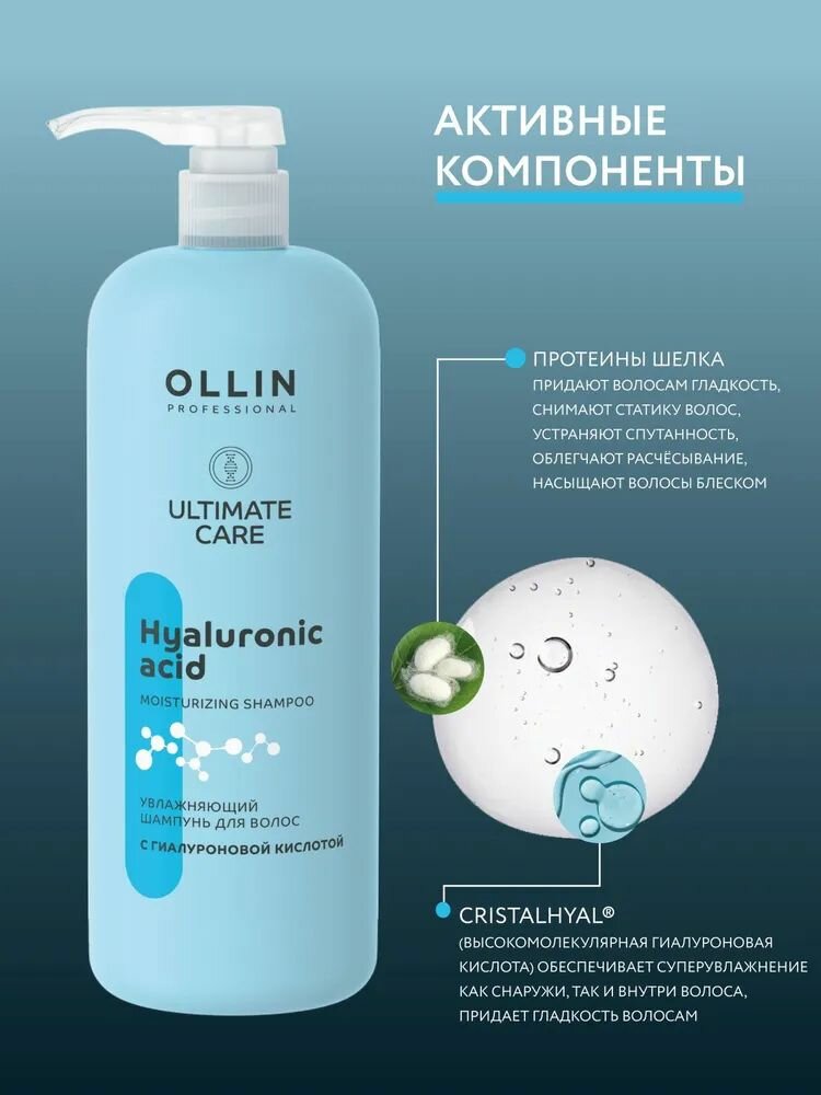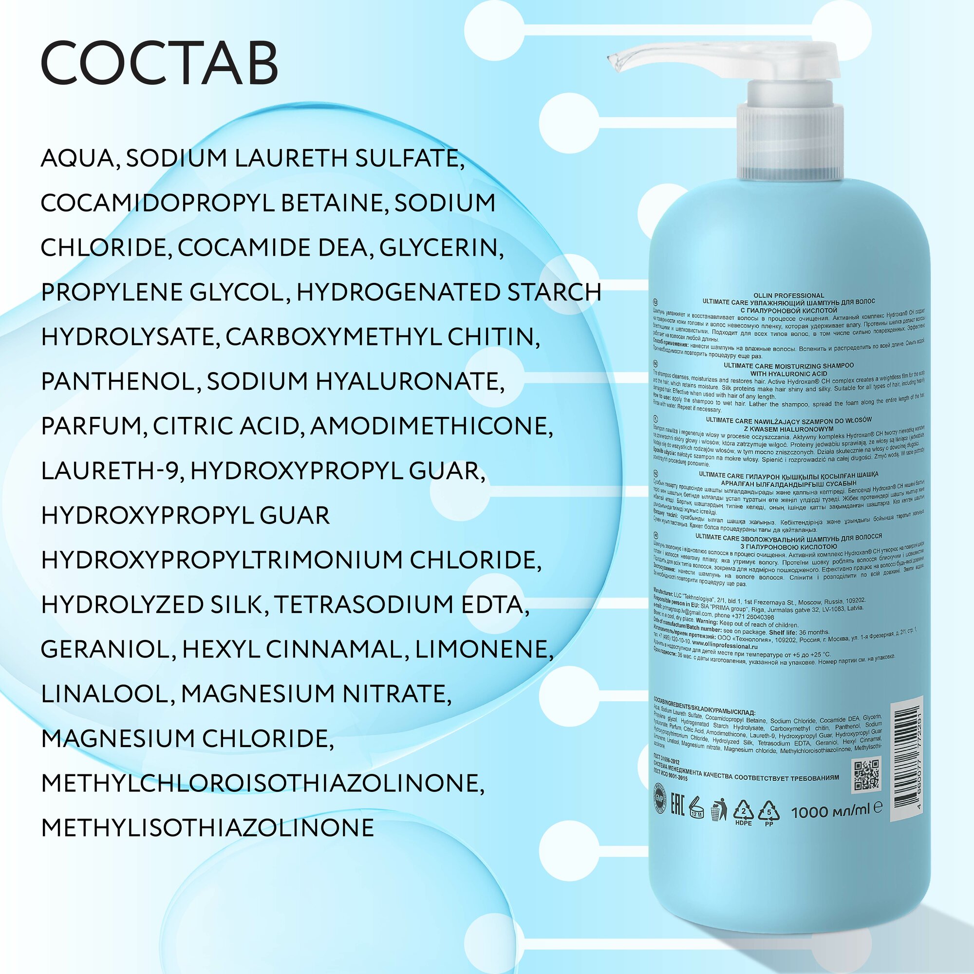 OLLIN, ULTIMATE CARE, Увлажняющий шампунь для волос с гиалуроновой кислотой, 1000 мл