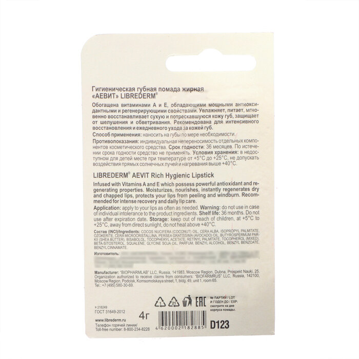 | Способ применения | наносить на губы по мере необходимости. Рекомендована для ежедневного ухода, идеальная основа под макияж губ |