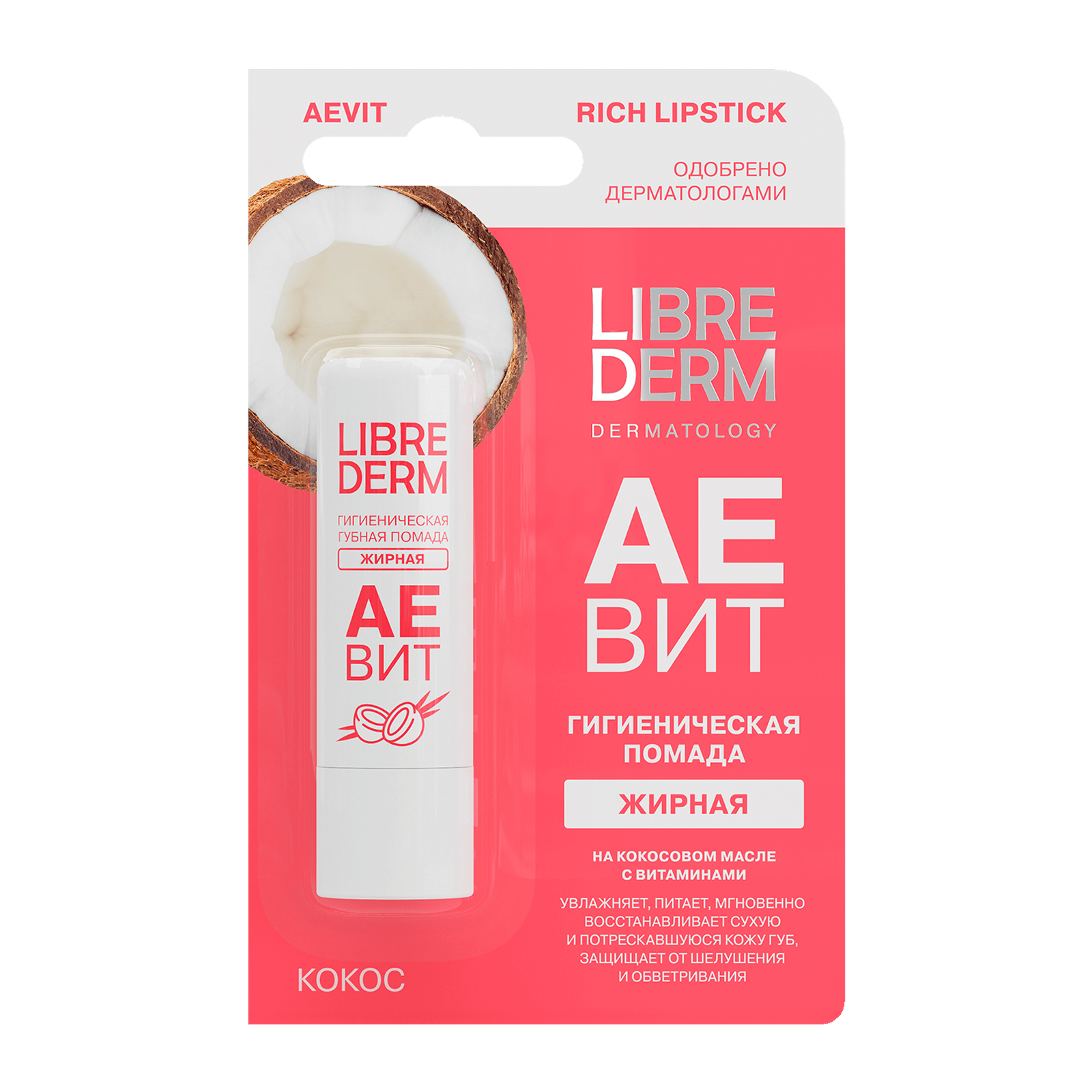 Аевит гигиеническая губная помада жирная Кокос 4 г, LIBREDERM
