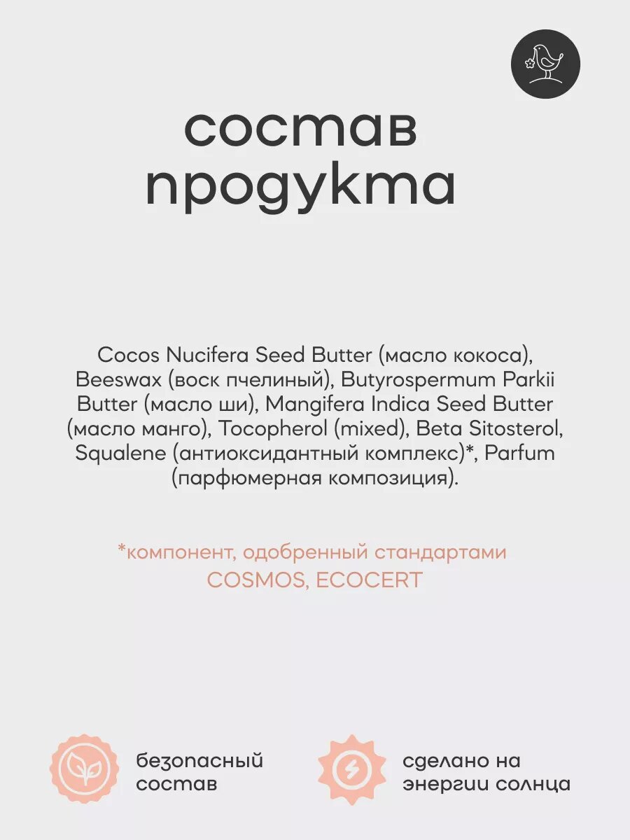 | Состав | Cocos Nucifera Seed Butter (масло кокоса), Butyrospermum Parkii Butter (масло ши), Mangifera Indica Seed Butter (масло манго), Beeswax (воск пчелиный), Camellia Sinensis Leaf (чай матча), Mentha Piperita Oil (эфирное масло мяты), Litsea Cubeba Fruit Oil (эфирное масло литсея кубеба) Tocopherol (mixed), Beta Sitosterol, Squalene (антиоксидантный комплекс). |