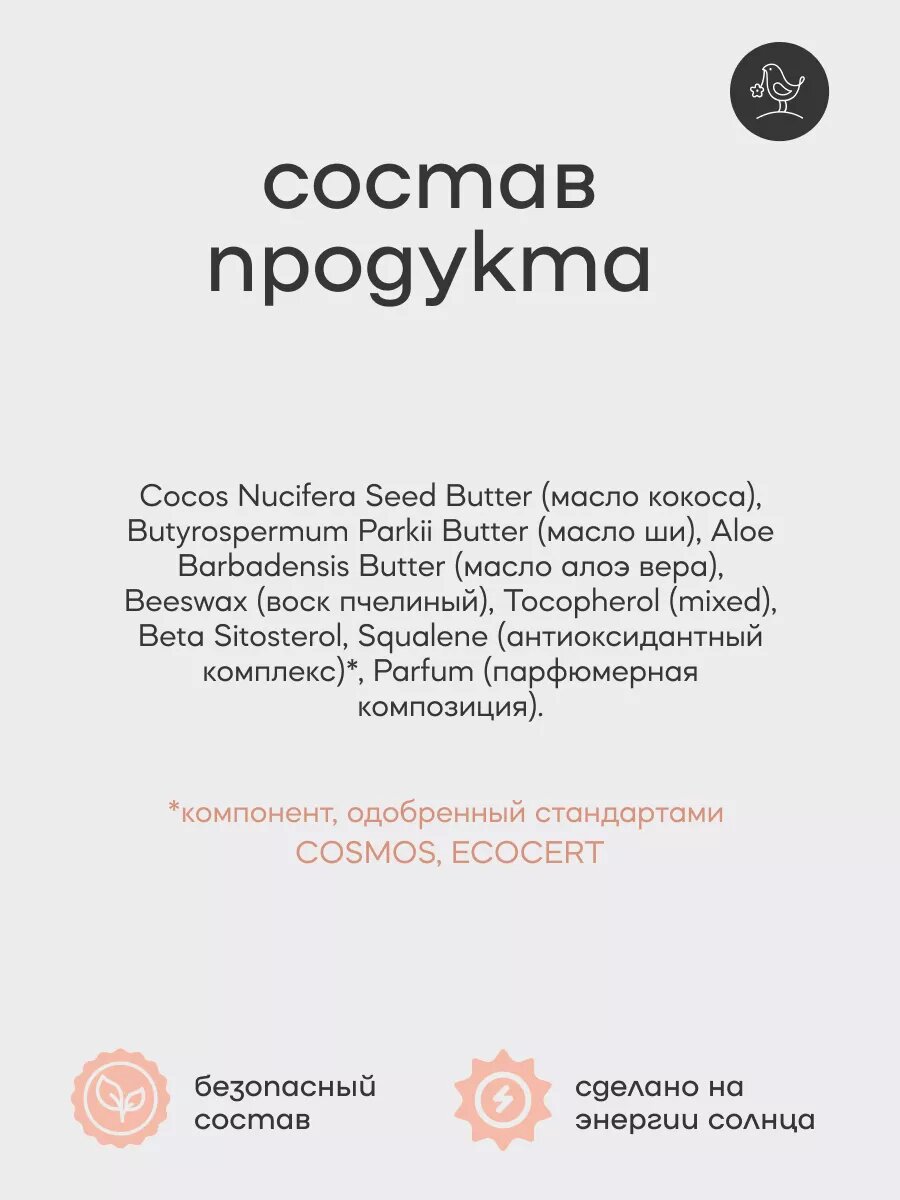 | Состав | Cocos Nucifera Seed Butter (масло кокоса), Butyrospermum Parkii Butter (масло ши), Mangifera Indica Seed Butter (масло манго), Beeswax (воск пчелиный), Camellia Sinensis Leaf (чай матча), Mentha Piperita Oil (эфирное масло мяты), Litsea Cubeba Fruit Oil (эфирное масло литсея кубеба) Tocopherol (mixed), Beta Sitosterol, Squalene (антиоксидантный комплекс). |