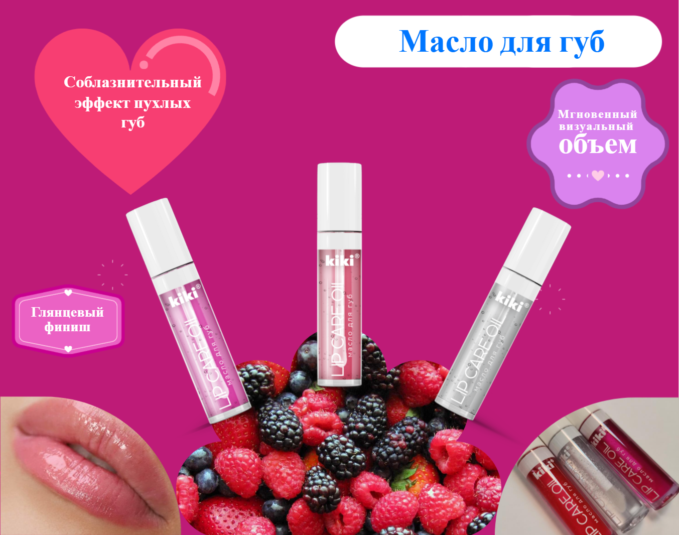 Масло для губ KIKI LIP CARE OIL с ароматом "малина" тон 01, блеск, увлажнение, защита, 3,5 мл, кики