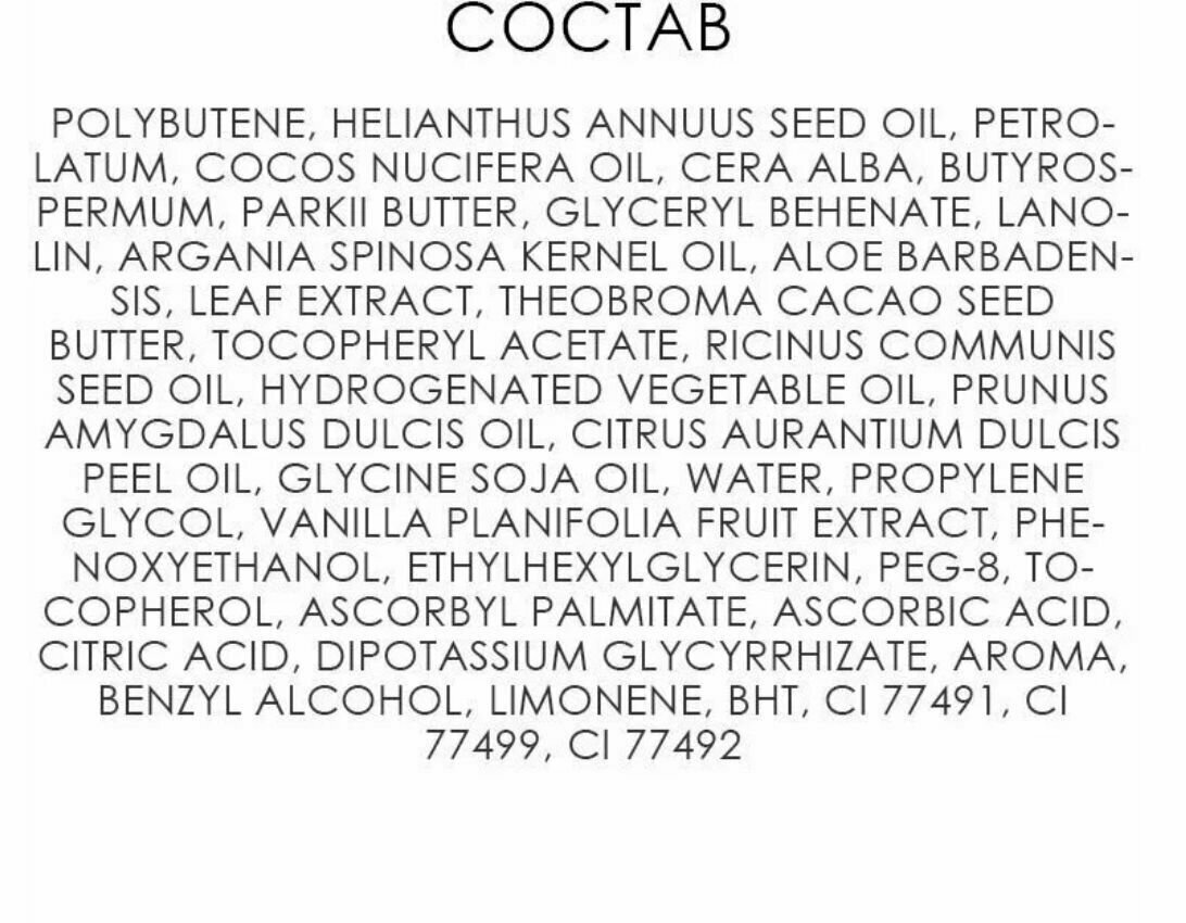 | Состав | polybutene, paranum liquidum, isocetyl stearoyl stearate, castor oil bis-hydroxypropyl dimethicone esters, vp/hexadecene copolymer, hydroxystearic acid, parfum, isohexadecane, ethyl menthane carboxamide, stearic acid, argania spinosa kernel oil, ethylhexyl methoxycin - namate, isostearic acid, ethylene/propylene/styrene copolymer, tocopherol, palmitic acid, butylene/propylene/styrene copolymer, peg-8, sodium hyaluronate, xanthan gum, phenoxyethanol, ascorbyl palmitate, isostearoyl hydrolyzed collagen, ascorbic acid, citric acid, tripeptide-1, bht |