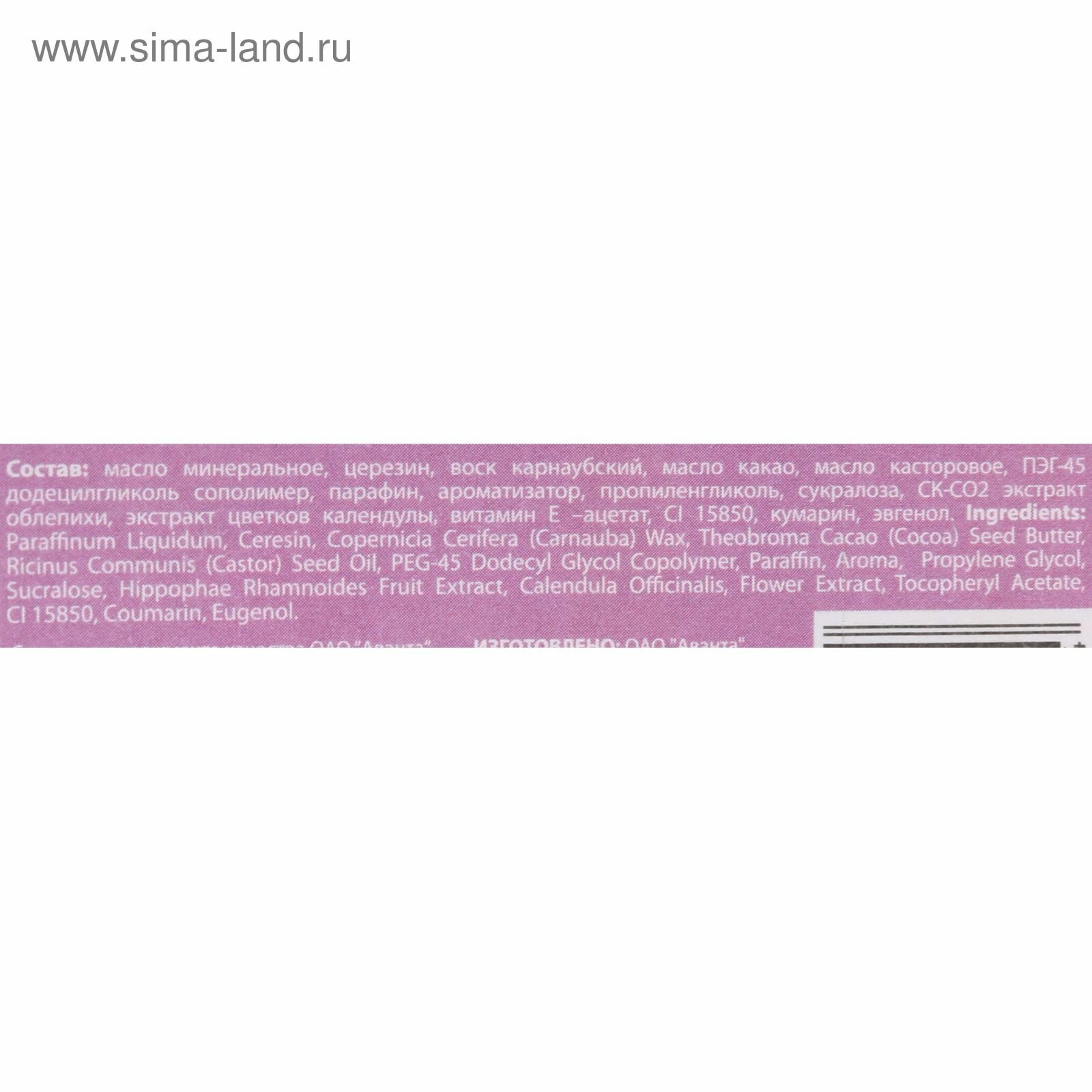 | Состав | масло минеральное, церезин, воск карнаубский, масло какао, масло касторовое, ПЭГ-45 додецилгликоль сополимер, парафин, ароматизатор, пропиленгликоль, сукралоза, СК-СО2 экстракт облепихи, экстракт цветков календулы, витамин Е-ацетат, CI 15850, кумарин, эвгенол |