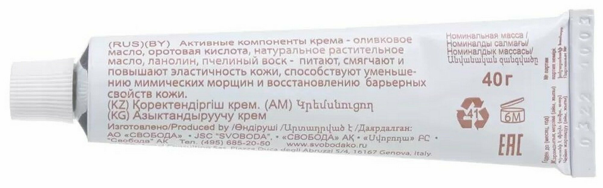 | Состав | вода, ланолин, минеральные масла, косметическая основа, пчелиный воск, подсолнечное масло, оливковое масло, парфюмерная композиция, оротовая кислота |