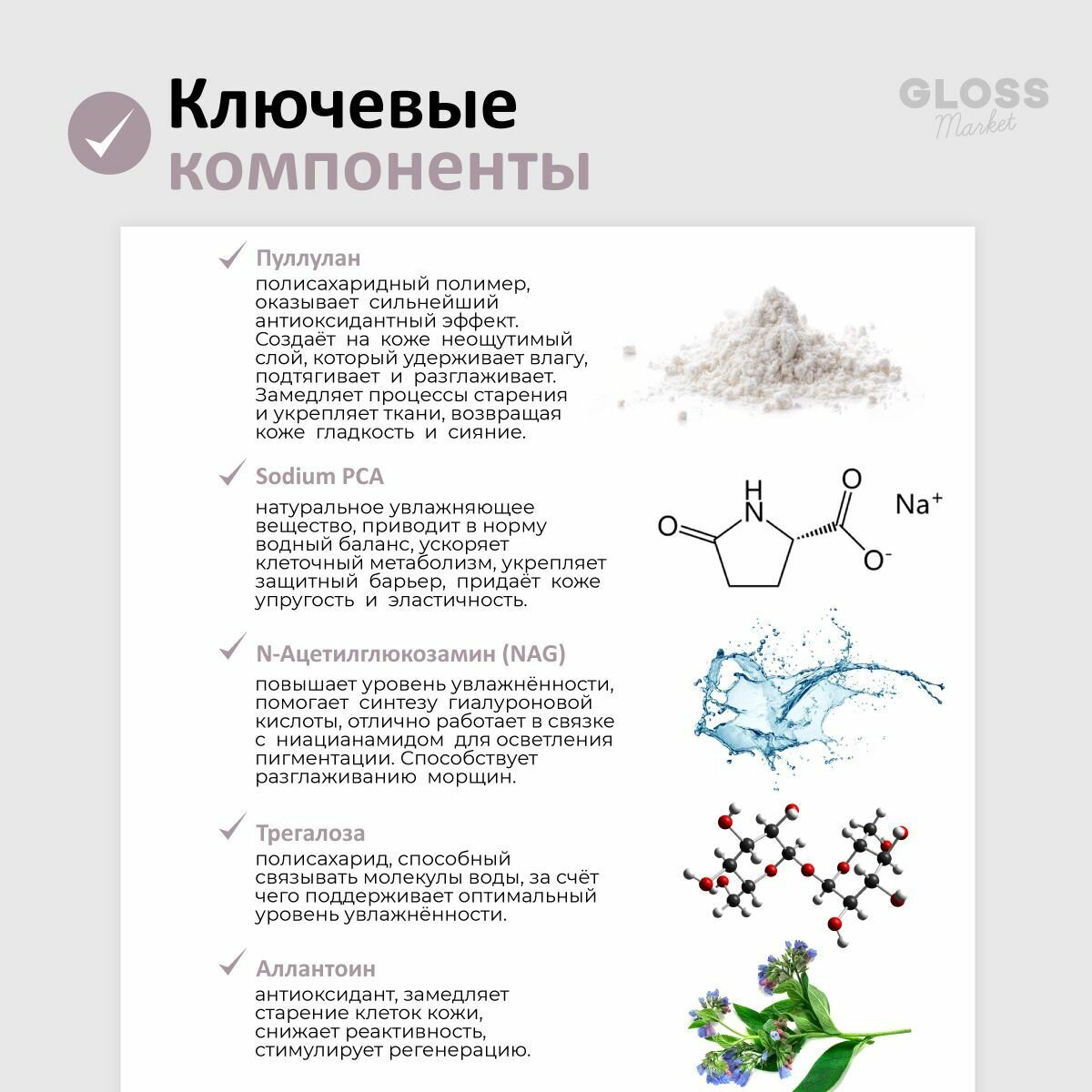 | Активный ингредиент | AHA-кислоты / аллантоин / витамин B3 (ниацинамид) / витамин C (аскорбиновая кислота) / витамин E / витамины / глицерин / керамиды / лимонная кислота / пантенол (провитамин B5) / прополис / салициловая кислота / центелла азиатская / церамиды / цинк |