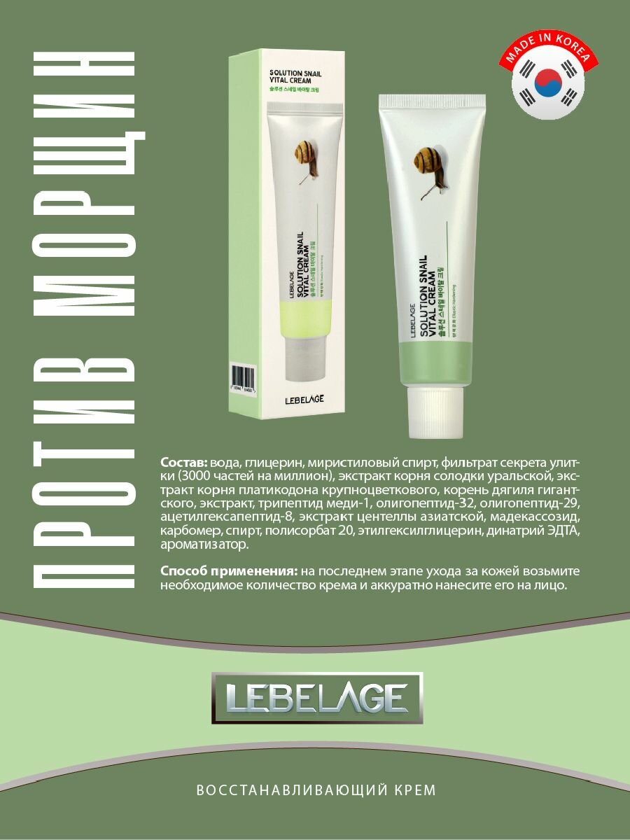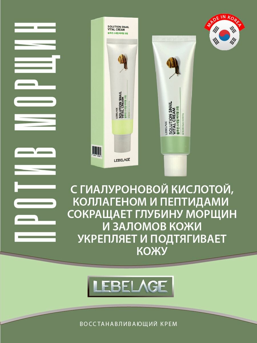 LEBELAGE Восстанавливающий крем для ухода за кожей лица, шеи и зоны декольте с муцином улитки и пептидами, корейская косметика. 50мл