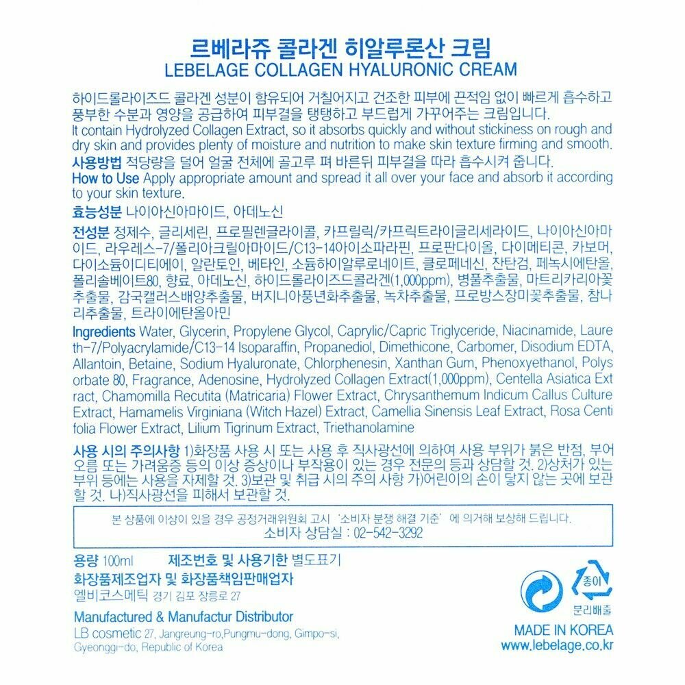 LEBELAGE Увлажняющий крем для ухода за кожей лица, шеи и зоны декольте с коллагеном, корейская косметика. 100мл