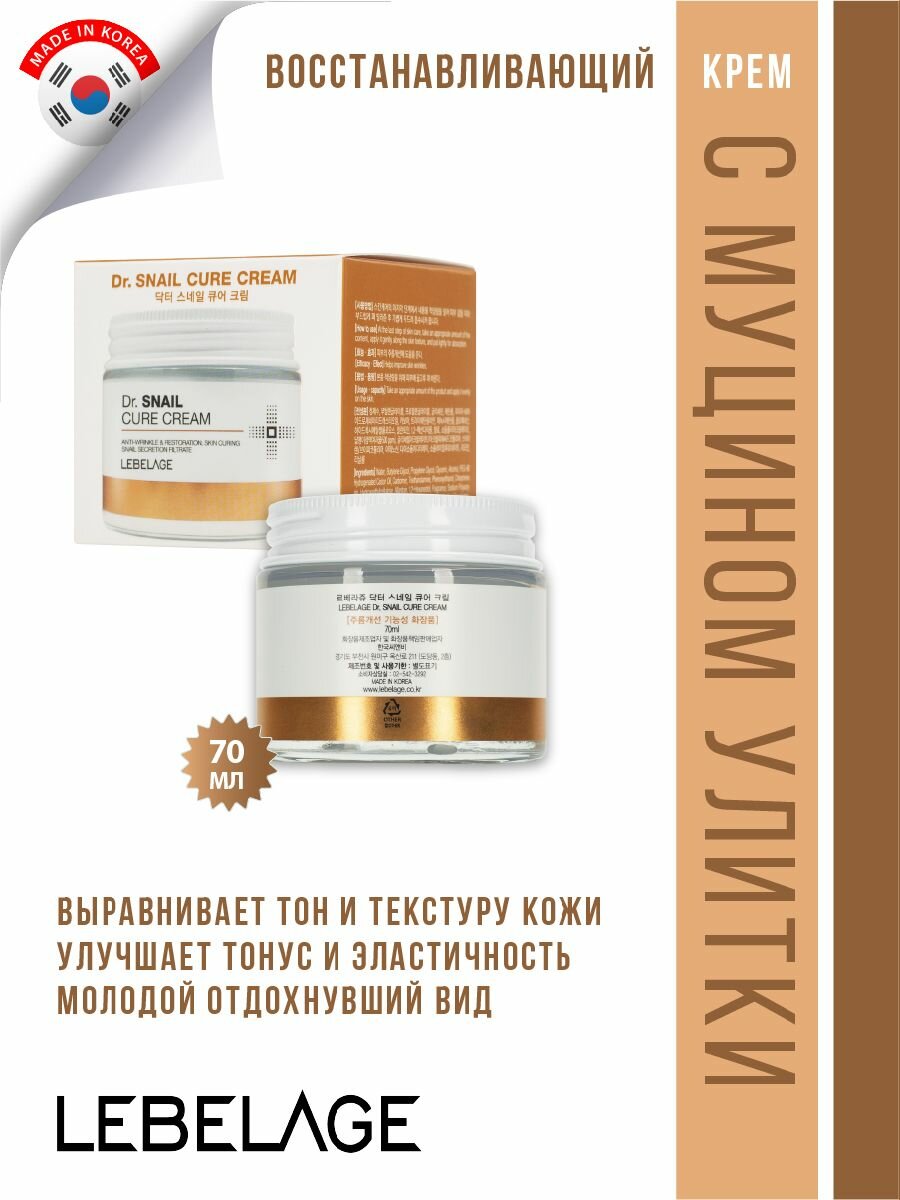 Lebelage Антивозрастной восстанавливающий крем с муцином улитки / Dr. Snail Cure Cream, 70 мл