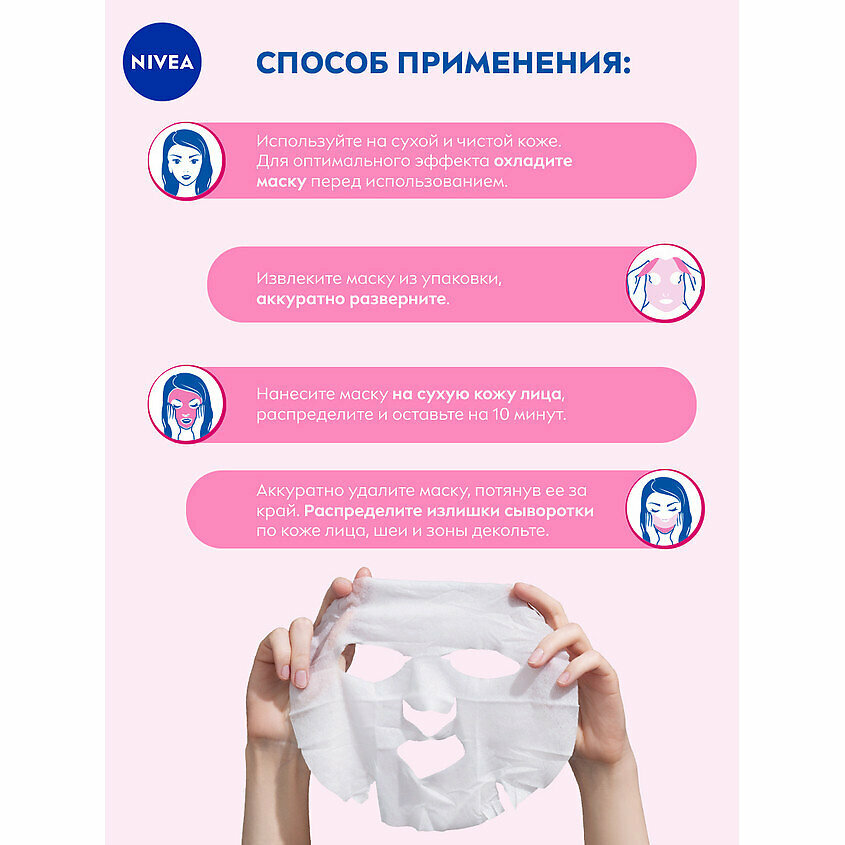 | Способ применения | используйте на сухой и чистой коже. Для оптимального эффекта охладите маску перед использованием. Извлеките маску из упаковки, аккуратно разверните. Нанесите маску на сухую кожу лица, распределите и оставьте на 10 минут. Не наносите на раздраженную или поврежденную кожу. Избегайте попадания в глаза. Аккуратно удалите маску, потянув ее за край. Распределите излишки сыворотки по коже лица, шеи и зоны декольте. Не требует смывания |