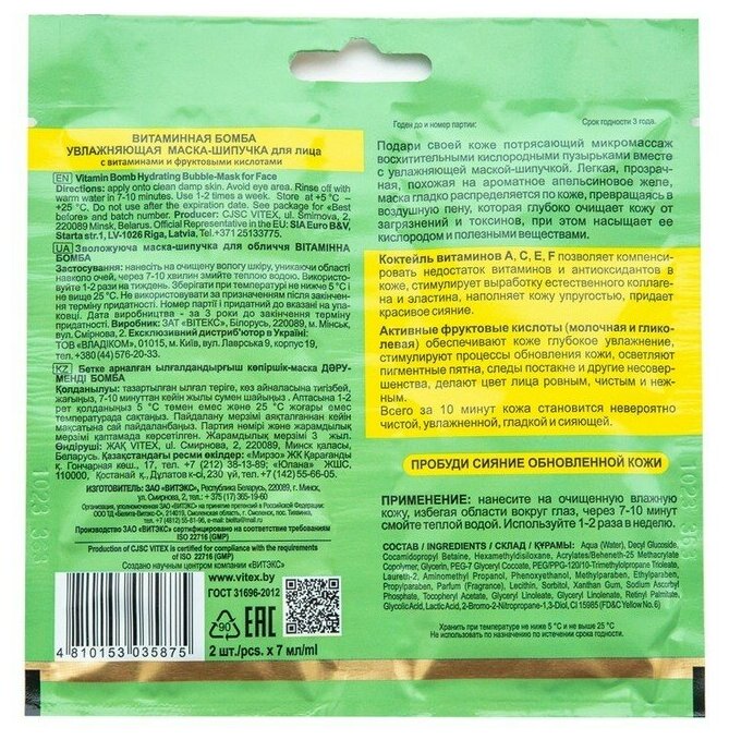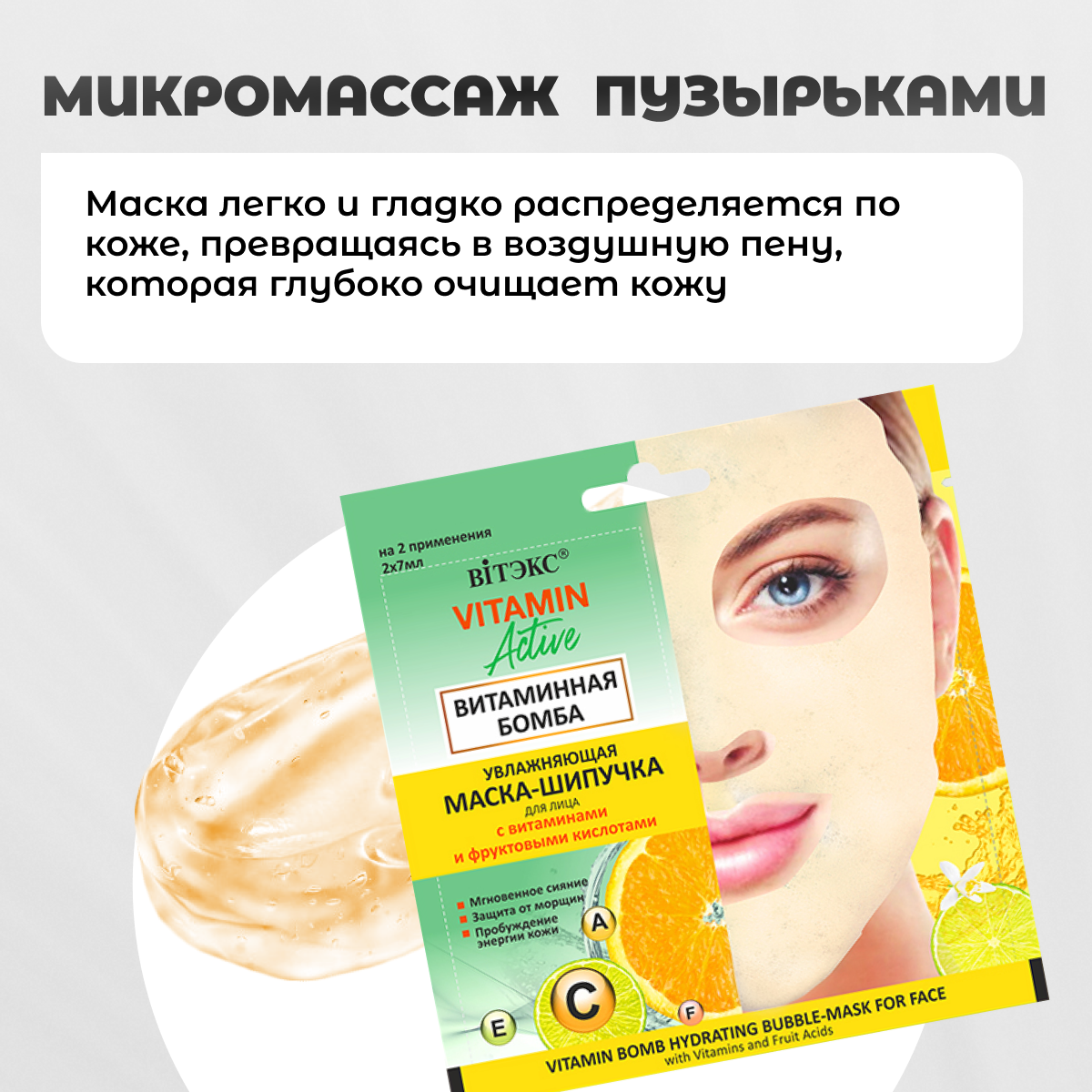 Маска-шипучка для лица Белита-Витекс "Vitamin Active", Витаминная бомба, увлажняющая, 2 саше по 7 мл