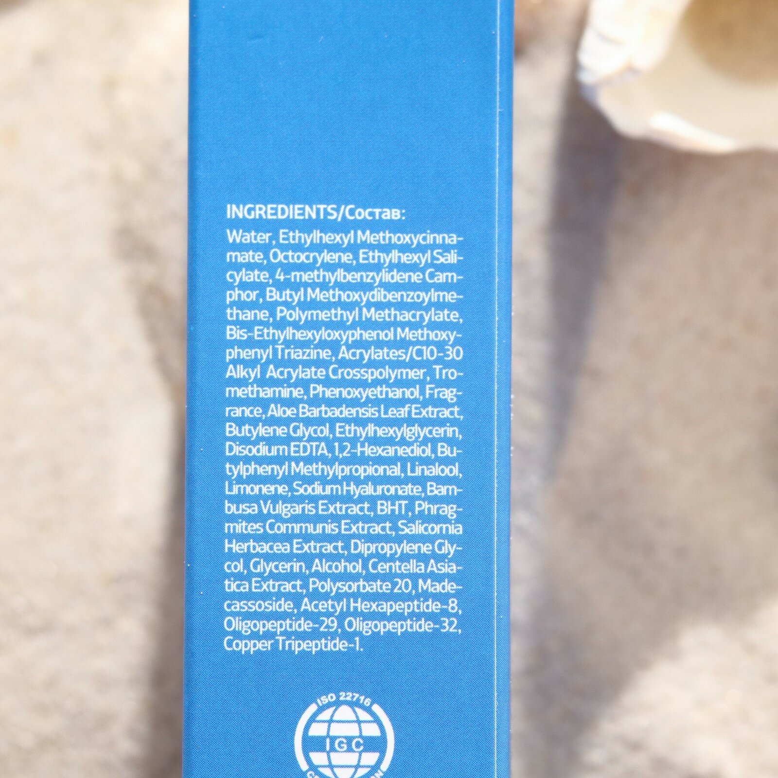 | Состав | water, ethylhexyl methoxycinnamate, octocrylene, ethylhexyl salicylate, 4-methylbenzylidene camphor, butyl methoxydibenzoylmethane, polymethyl methacrylate, bis-ethylhexyloxyphenol methoxyphenyl triazine, acrylates/c10-30 alkyl acrylate crosspolymer, tromethamine, phenoxyethanol, fragrance, aloe barbadensis leaf extract, butylene glycol, ethylhexylglycerin, disodium edta, 1,2-hexanediol, butylphenyl methylpropional, linalool, limonene, sodium hyaluronate, bambusa vulgaris extract, bht, phragmites communis extract, salicornia herbacea extract, dipropylene glycol, glycerin, alcohol, centella asiatica extract, polysorbate 20, madecassoside, acetyl hexapeptide-8, oligopeptide-29, oligopeptide-32, copper tripeptide-1 |