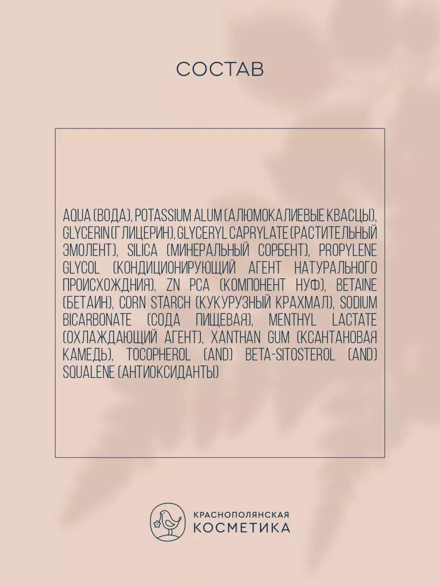 | Полный состав | Aqua (Вода), Lavandula Angustifolia Flower Water (Гидролат лаванды), Potassium Alum (Алюмокалиевые квасцы), Glycerin (Глицерин), Glyceryl Caprylate (Растительный эмолент), Silica (Минеральный сорбент), Propylene Glycol (Кондиционирующий агент натурального происхождния), Zn PCA (Компонент НУФ), Betaine (Бетаин), Lavandula Angustifolia Oil (Эфирное масло лаванды), Corn Starch (Кукурузный крахмал), Sodium Bicarbonate (Сода пищевая), Menthyl Lactate (Охлаждающий агент), Xanthan Gum (Ксантановая камедь), Tocopherol (and) Beta-Sitosterol (and) Squalene (Антиоксиданты). |