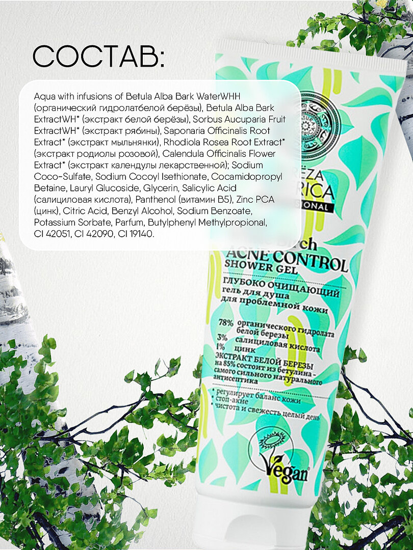 | Состав | Aqua with infusions of Betula Alba Bark WaterWHH (органический гидролат белой берёзы), Betula Alba Bark ExtractWH* (экстракт белой берёзы), Sorbus Aucuparia Fruit ExtractWH* (экстракт рябины), Saponaria Officinalis Root Extract* (экстракт мыльнянки), Rhodiola Rosea Root Extract* (экстракт родиолы розовой), Calendula Officinalis Flower Extract* (экстракт календулы лекарственной); Sodium Coco-Sulfate, Sodium Cocoyl Isethionate, Cocamidopropyl Betaine, Lauryl Glucoside, Glycerin, Salicylic Acid (салициловая кислота), Panthenol (витамин В5), Zinc PCA (цинк), Citric Acid, Benzyl Alcohol, Sodium Benzoate, Potassium Sorbate, Parfum, Butylphenyl Methylpropional, CI 42051, CI 42090, CI 19140. |