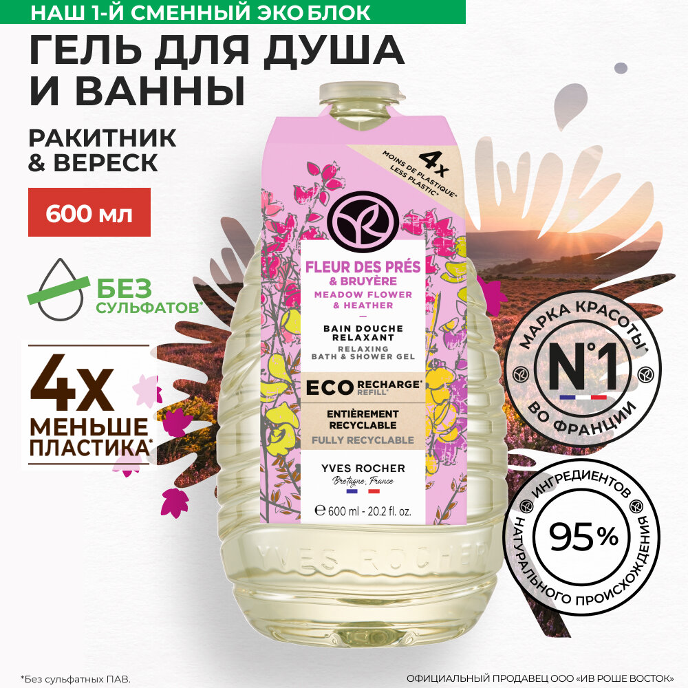 Купить Yves Rocher Гель для ванны и душа "Ракитник и вереск", сменный блок, 600мл