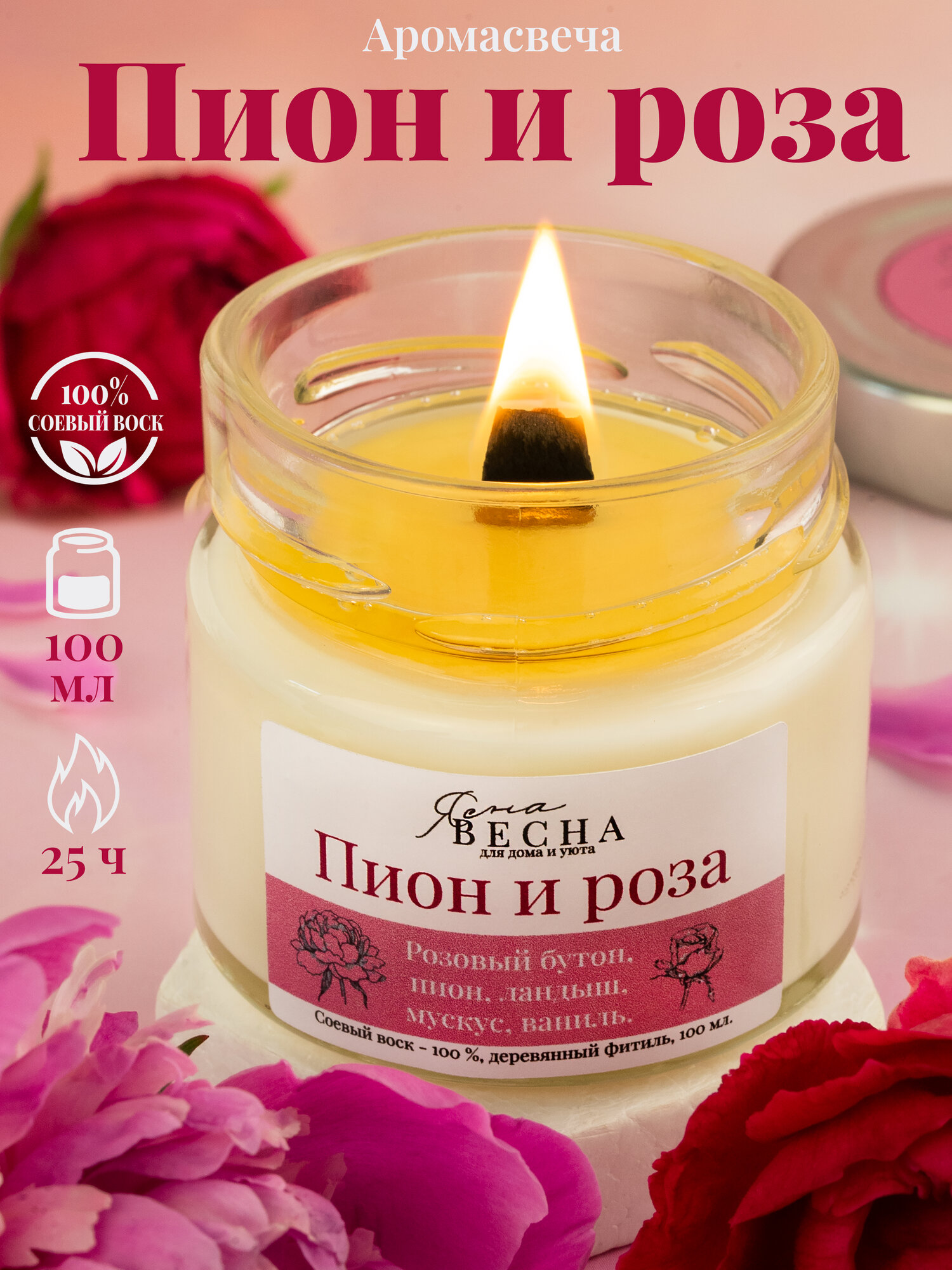 Купить Свеча ароматическая для дома с ароматом пион и роза в банке, объем 100 мл, двойной деревянный фитиль, соевый воск.