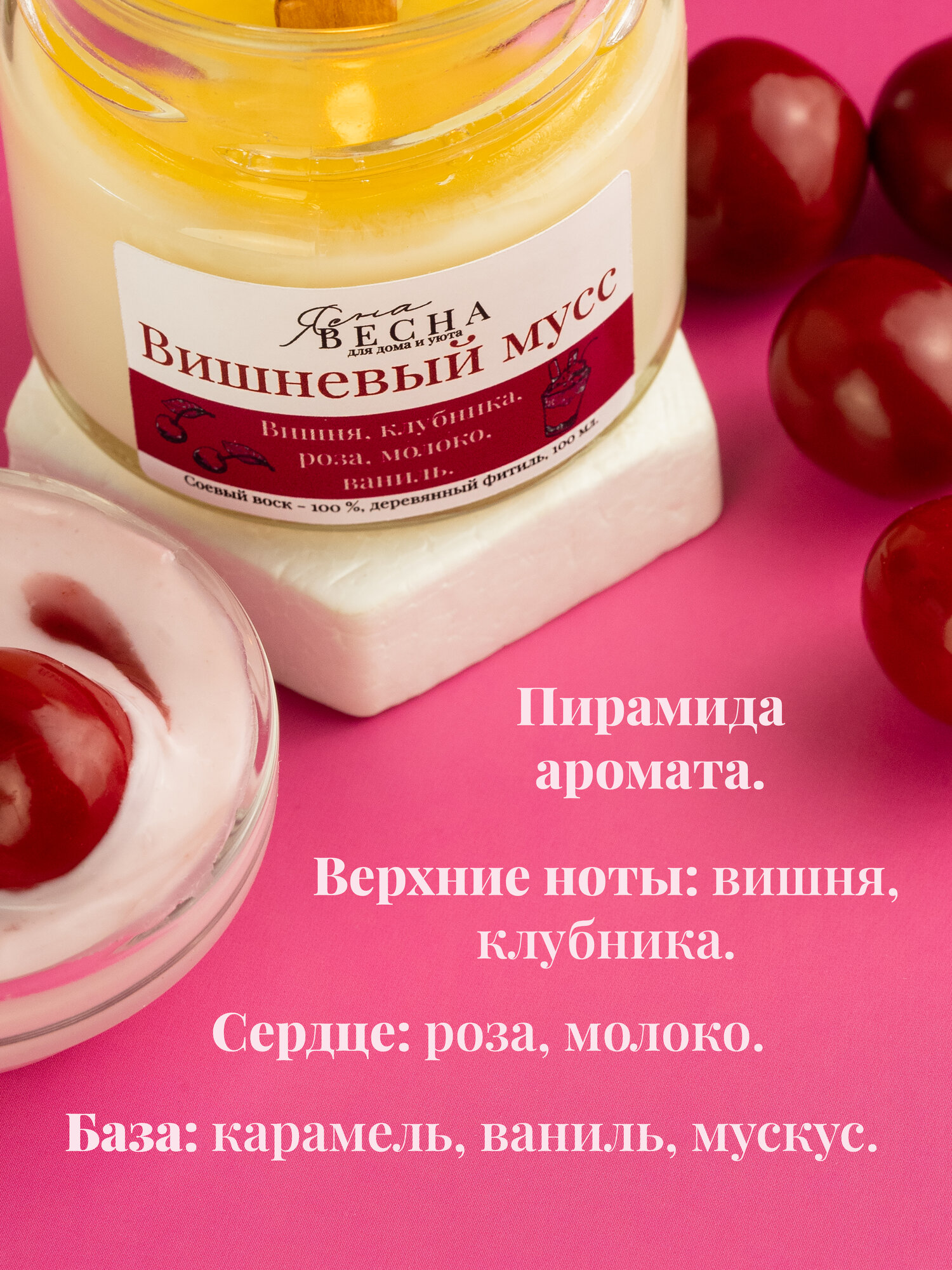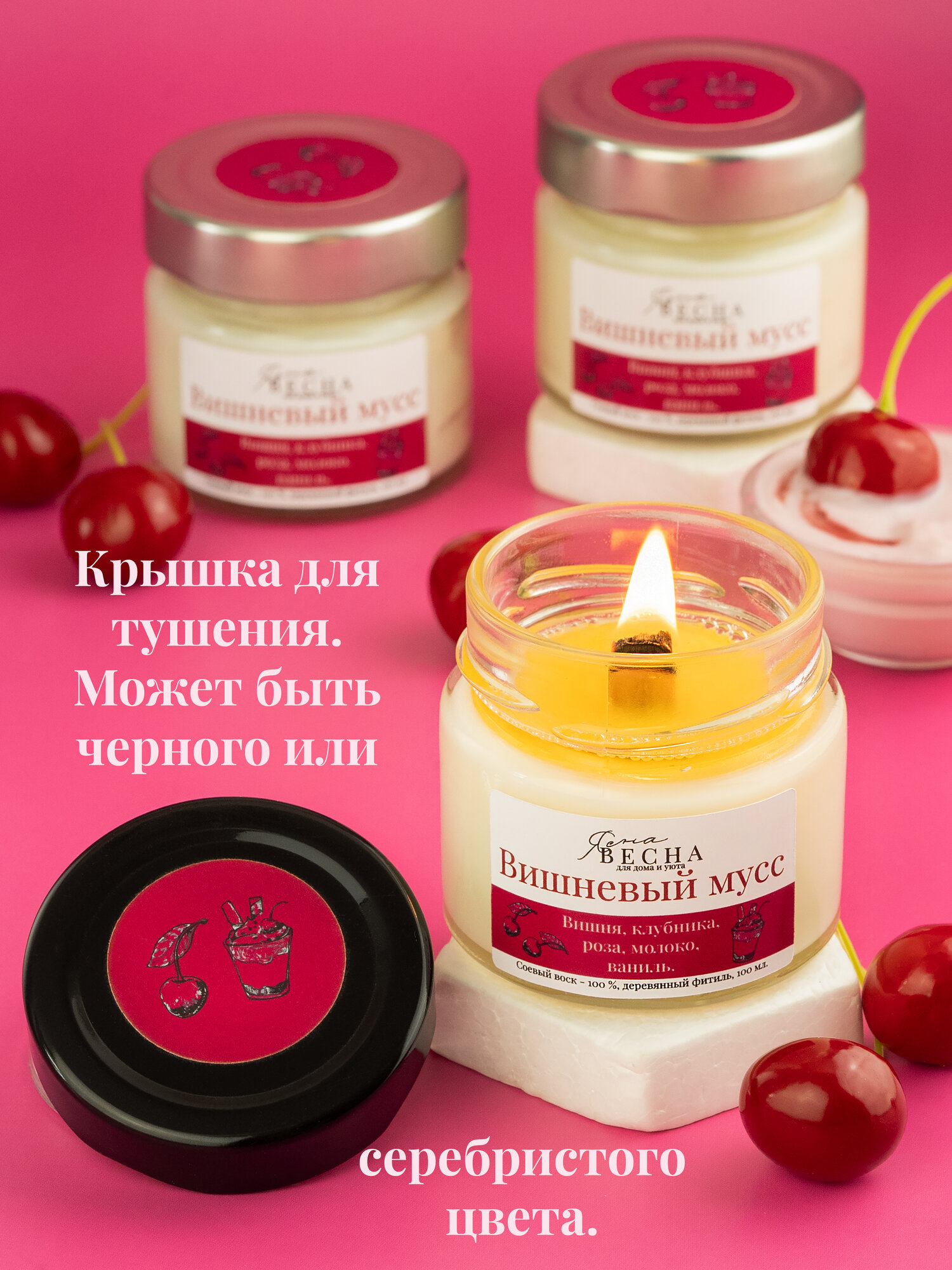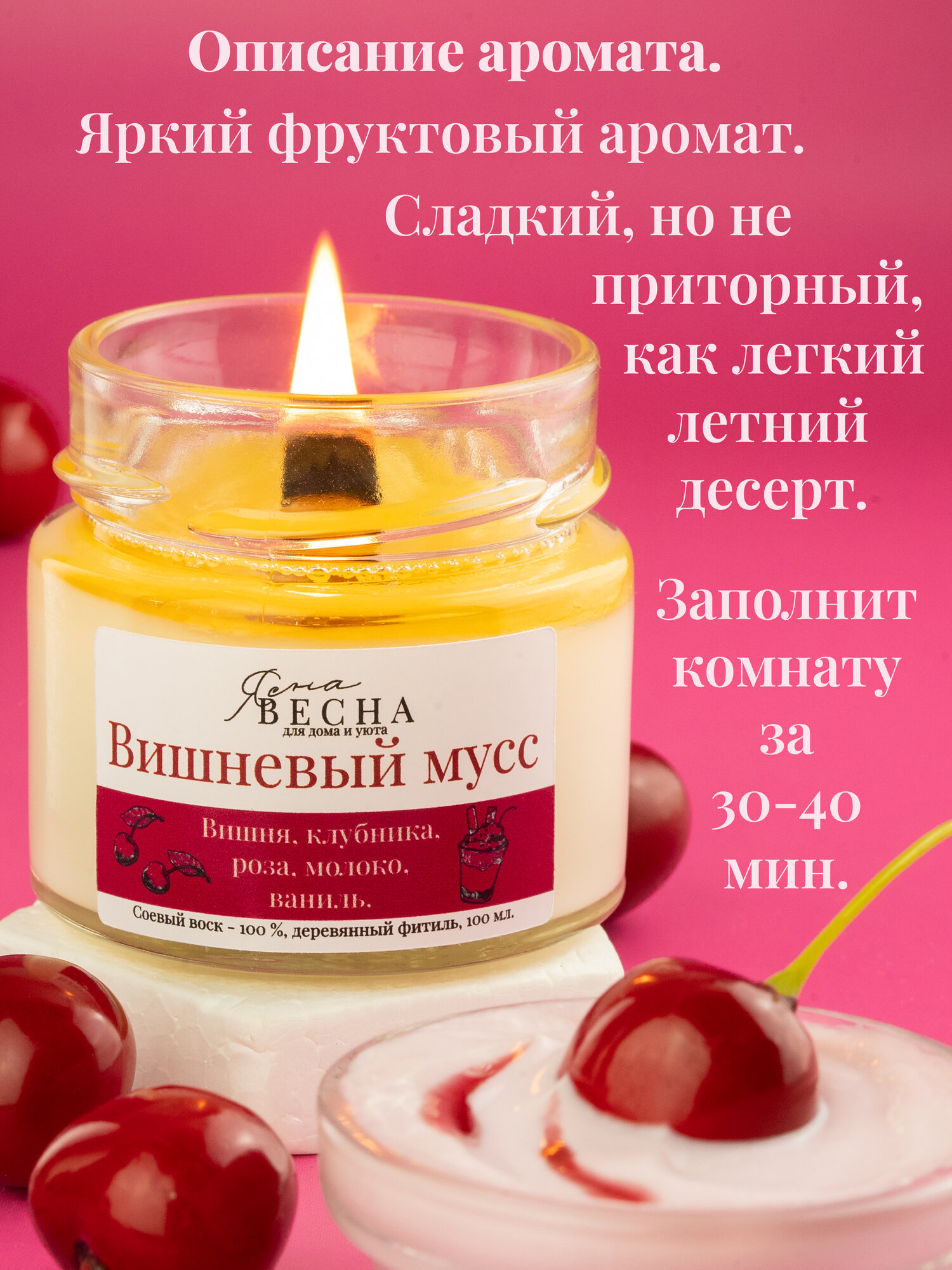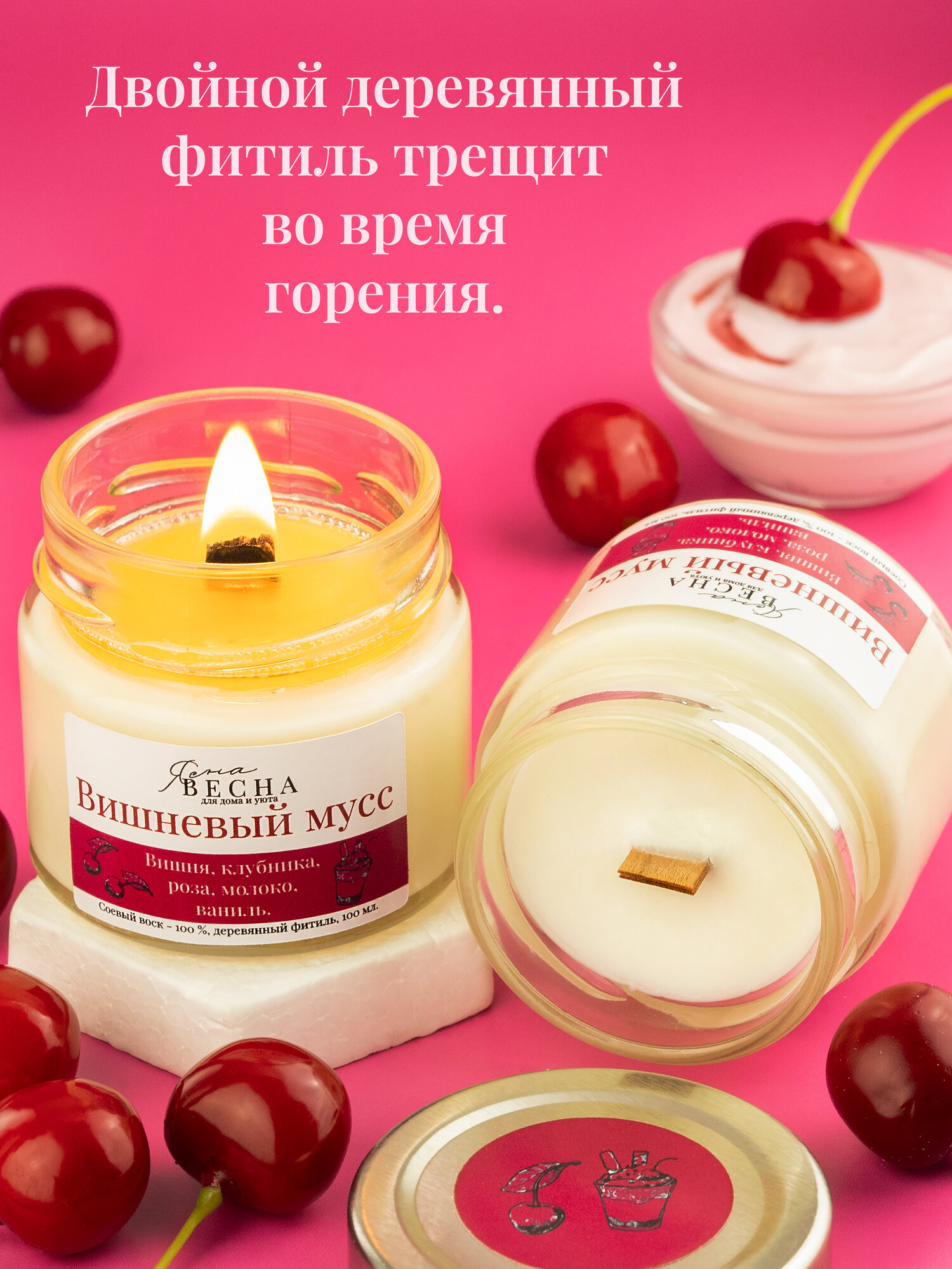 СохранитьСвеча ароматическая для дома с ароматом вишневый мусс в банке, объем 100 мл, двойной деревянный фитиль, соевый воск. интересное: