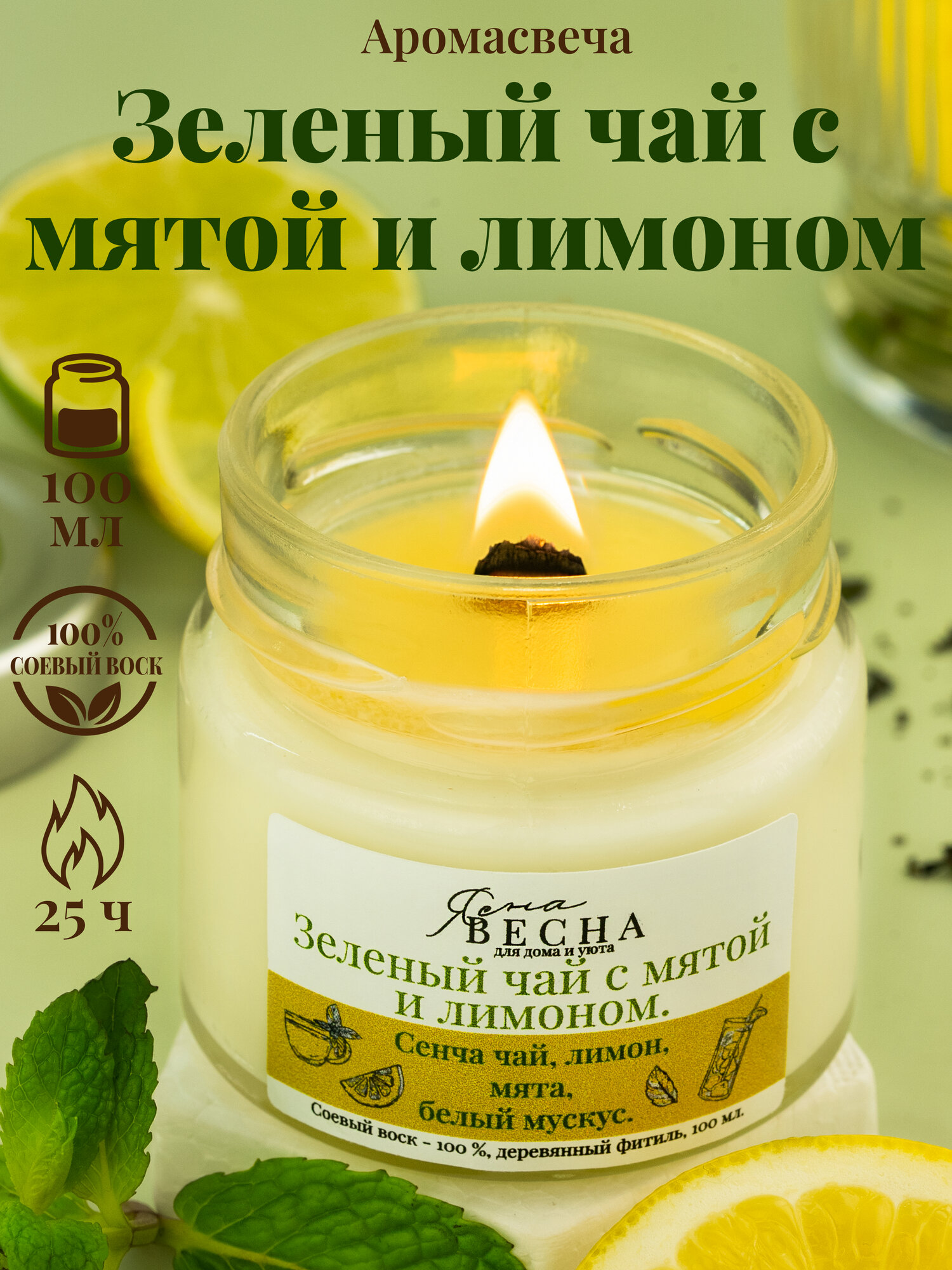 Купить Свеча ароматическая для дома с ароматом зеленый чай с мятой и лимоном в банке, объем 100 мл, двойной деревянный фитиль, соевый воск.