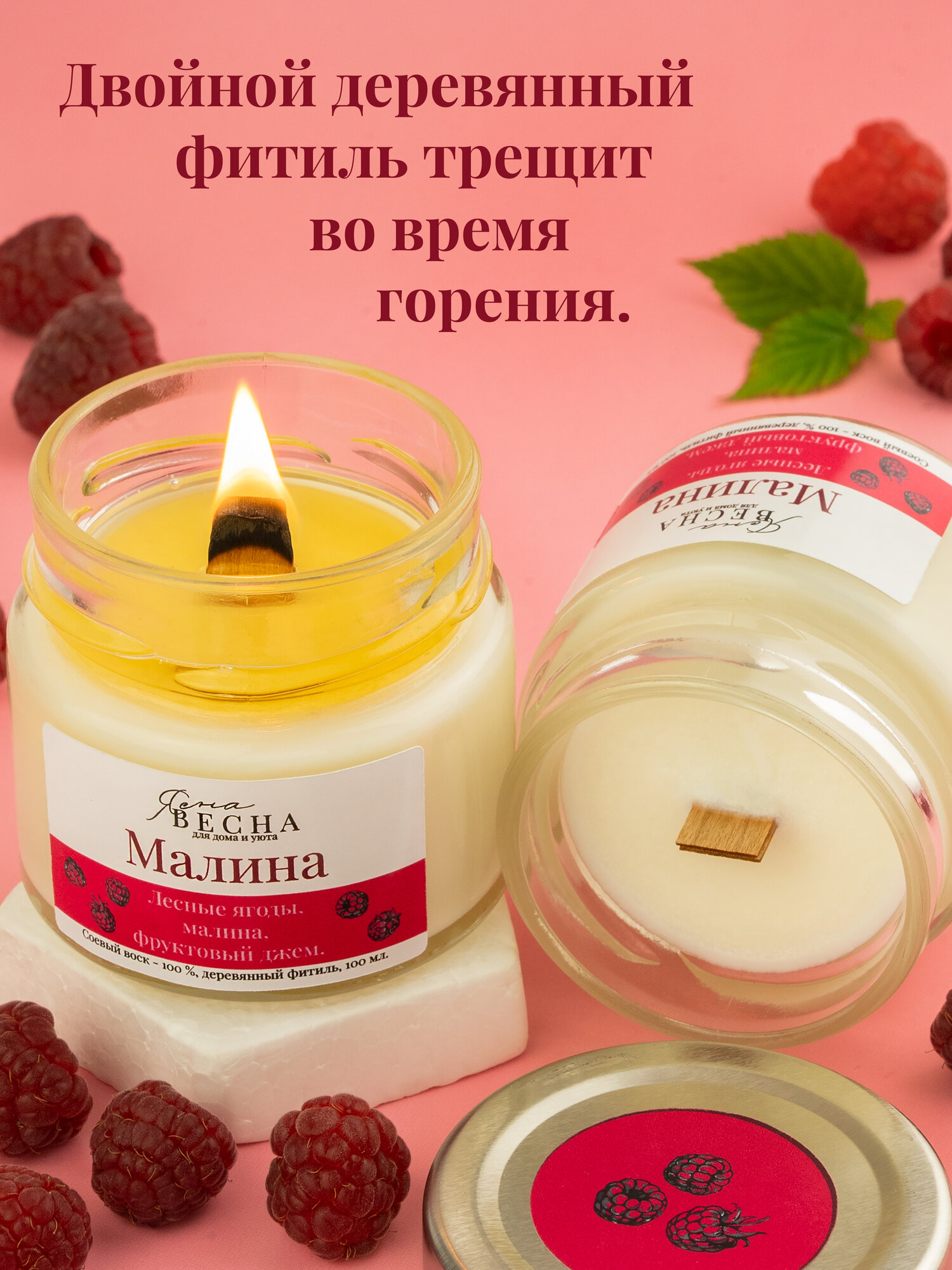 СохранитьСвеча ароматическая для дома с ароматом малина в банке, объем 100 мл, двойной деревянный фитиль, соевый воск. интересное: