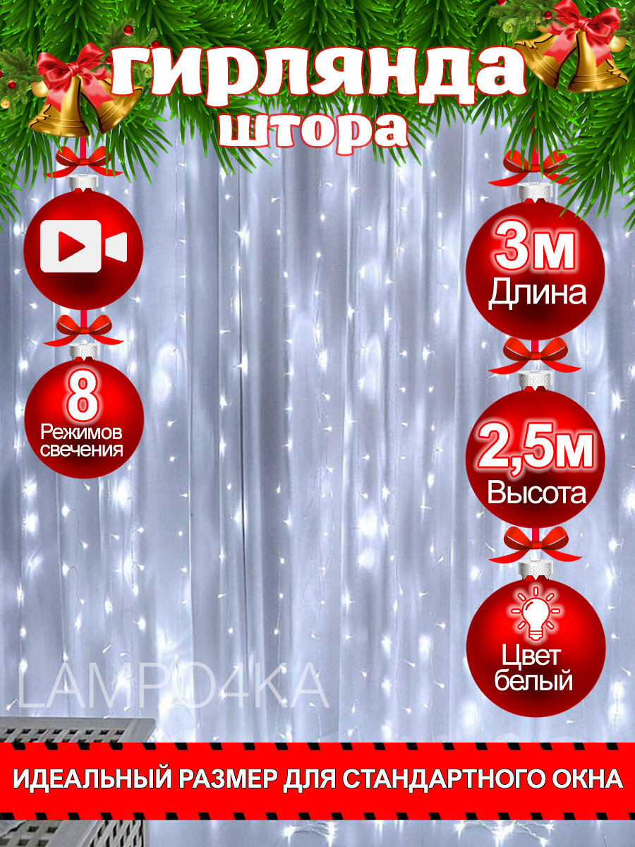 Светодиодная гирлянда-штора "LAMPO4KА", 3 х 2,5 метра, холодный белый цвет интересное: