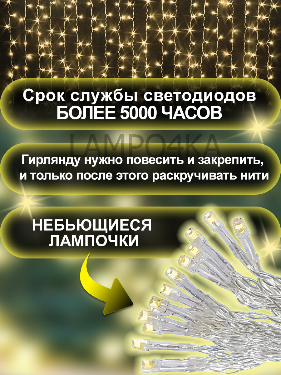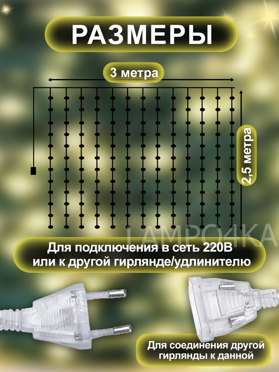Светодиодная гирлянда-штора "LAMPO4KА", 3 х 2,5 метра, теплый белый цвет
