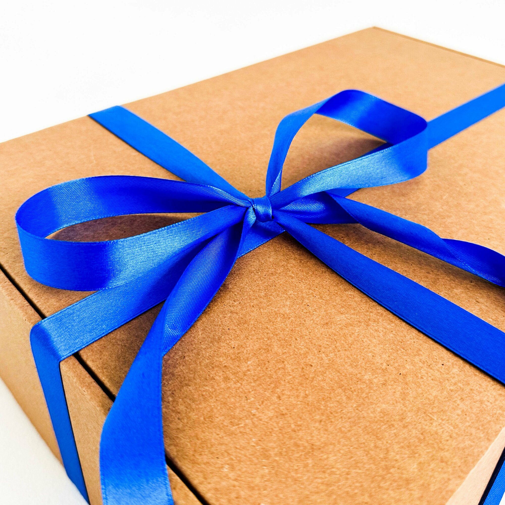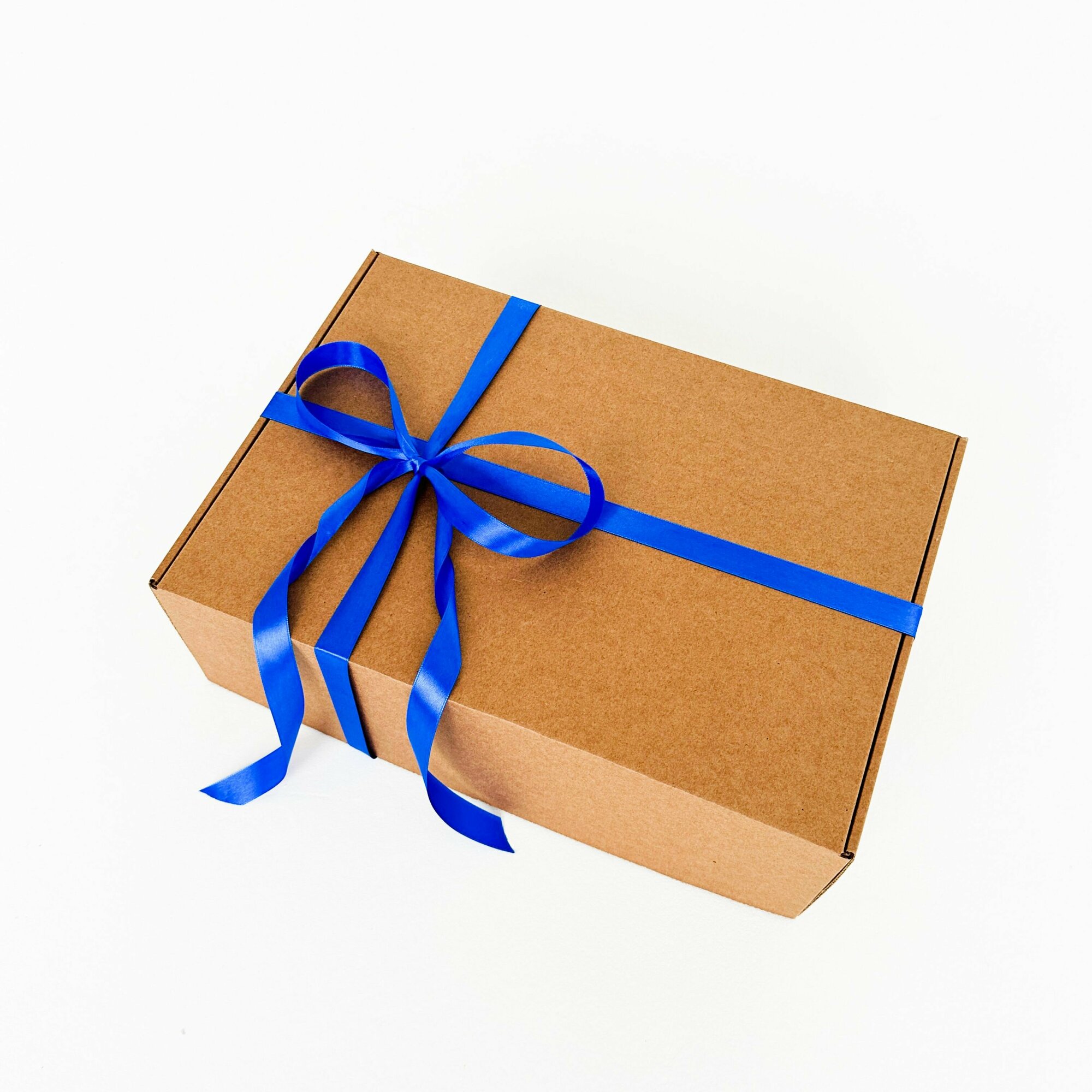 Большая подарочная коробка GILEV 37x37x14 см с синей лентой и наполнителем крафт