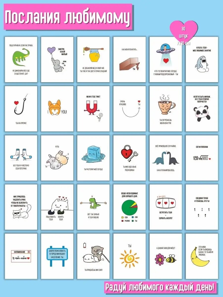 Ниже Вы можете прочитать отзывы на Любовные мини-открытки 30 штук для парня, ознакомится с подробными характеристиками, посмотреть интересные обзоры и фотографии на Любовные мини-открытки 30 штук для парня.