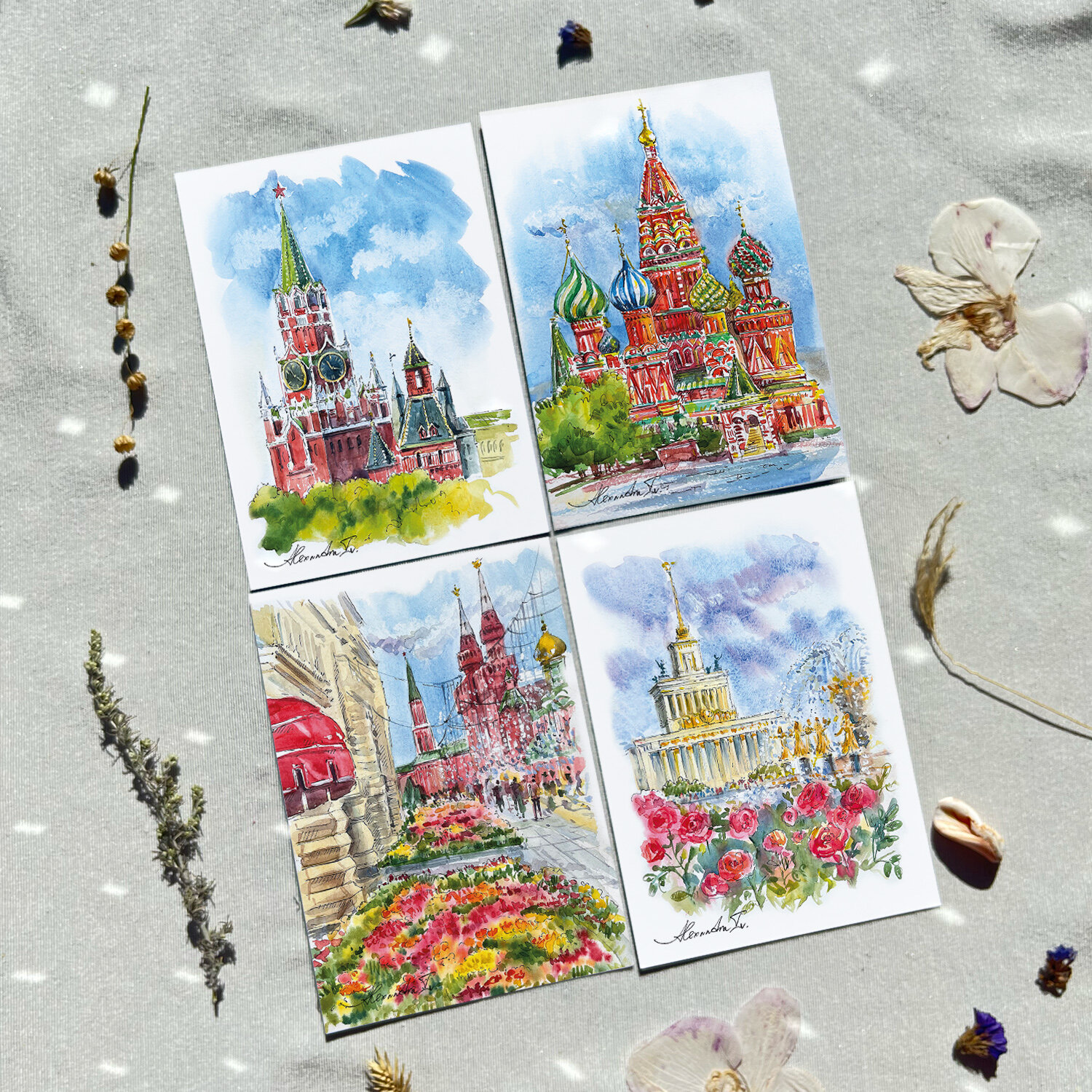 Купить Набор акварельных открыток Москва 14,8 х 10,5 см от Alexandra Iv. 4 шт. и 4 крафт-конверта