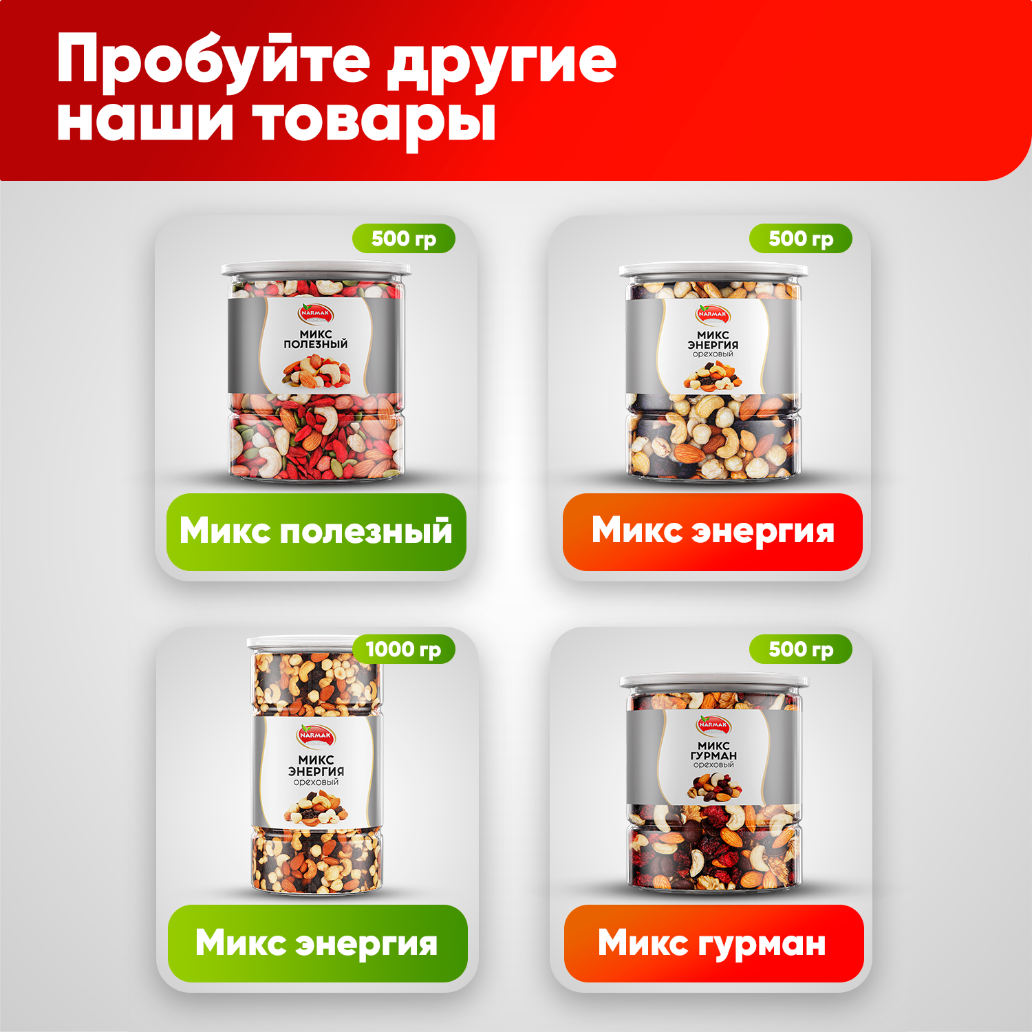 Ниже Вы можете прочитать отзывы на Смесь ореховая "Движение" (кешью, фундук, миндаль, арахис) 1000г/Narmak/Ореховая смесь из сушеных орехов, ознакомится с подробными характеристиками, посмотреть интересные обзоры и фотографии на Смесь ореховая "Движение" (кешью, фундук, миндаль, арахис) 1000г/Narmak/Ореховая смесь из сушеных орехов.
