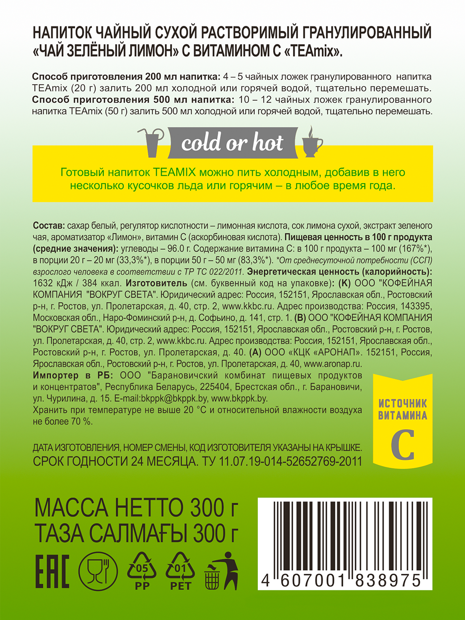 Чайный напиток TEAMIX гранулированный, растворимый Лимон (зеленый) 300 грамм , теамикс , Вокруг света интересное: