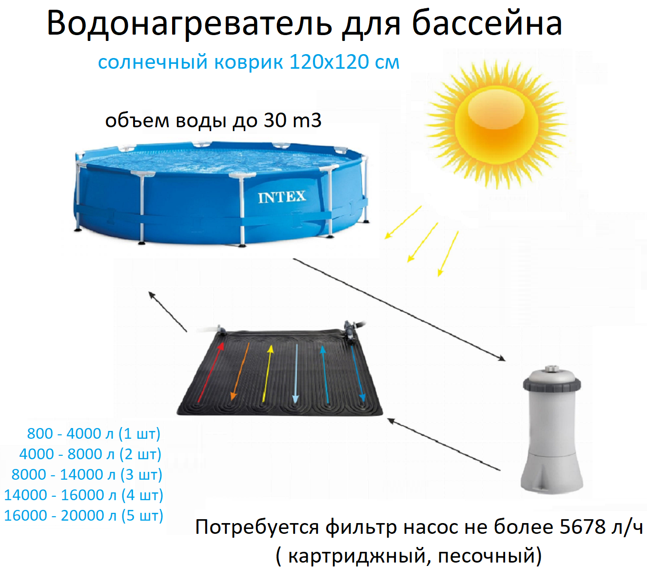 | Дополнительная информация | совместим с любыми сборными бассейнами оснащенными системой фильтрации;с такими нагревателями температура воды в бассейне повышается примерно на 3-5 C от температуры окружающей среды. |