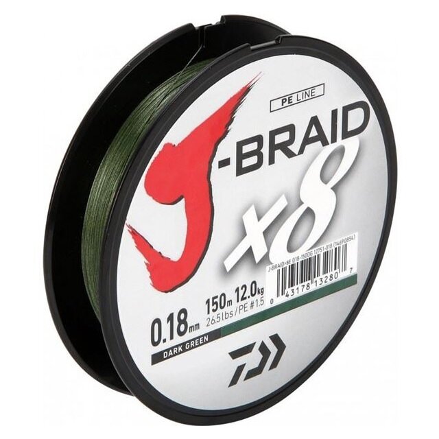 Плетеный шнур Daiwa J-Braidx8, 0.13 мм, 8.0 кг, 150 м, тёмно-зелёный