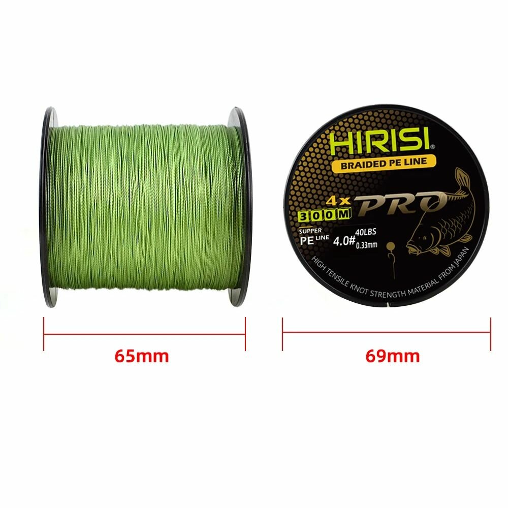 Шнур плетеный HIRISI четырехжильный №4.0 300м 40LB (18,18 кг) (BraidedPeLine №4.0_40LB) зеленый, материал - Япония, шнур рыболовный для ловли карпа