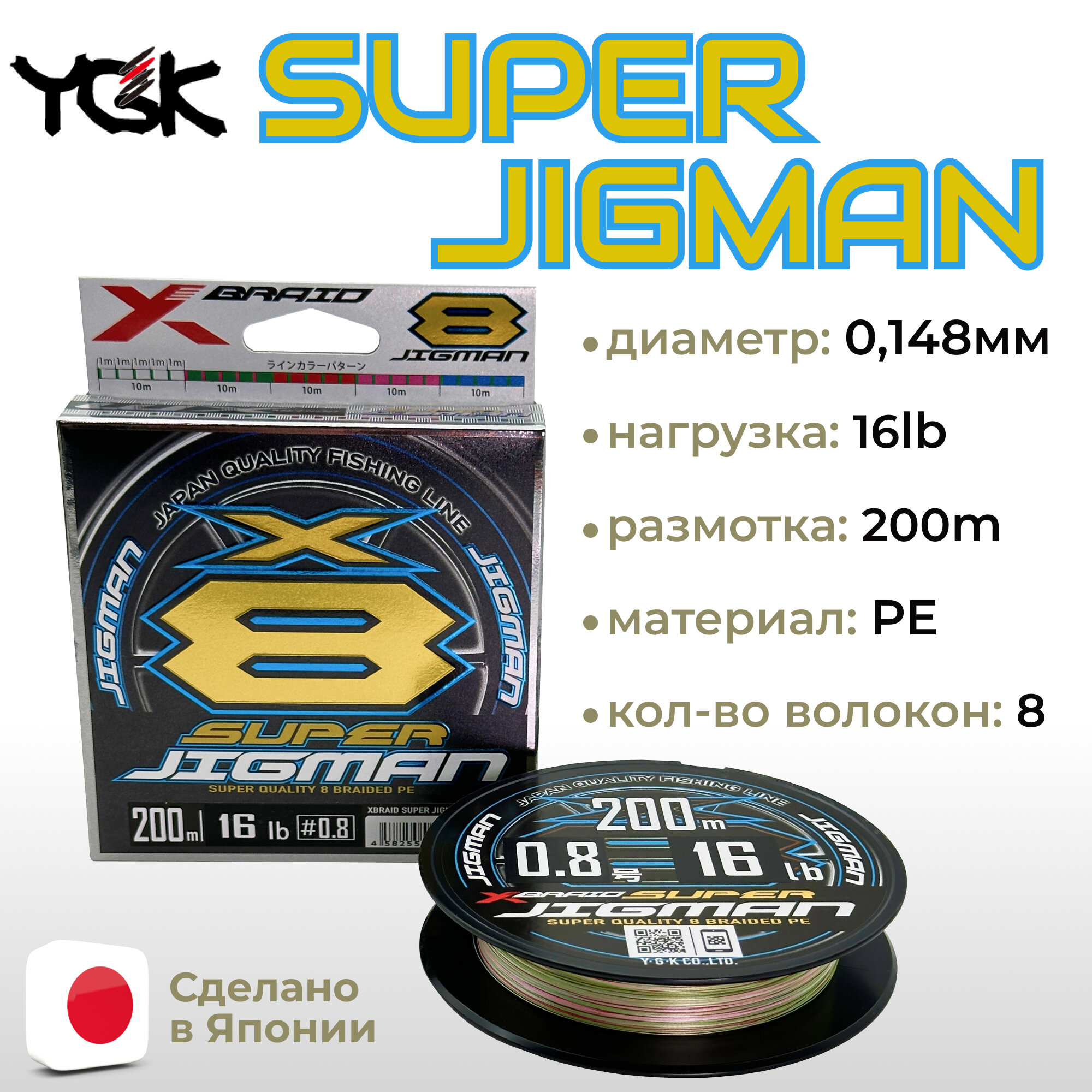 Плетеный шнур YGK X-BRAID SUPER JIGMAN PE X8 200m #0.8 (16lb/7.2кг/0.148mm)