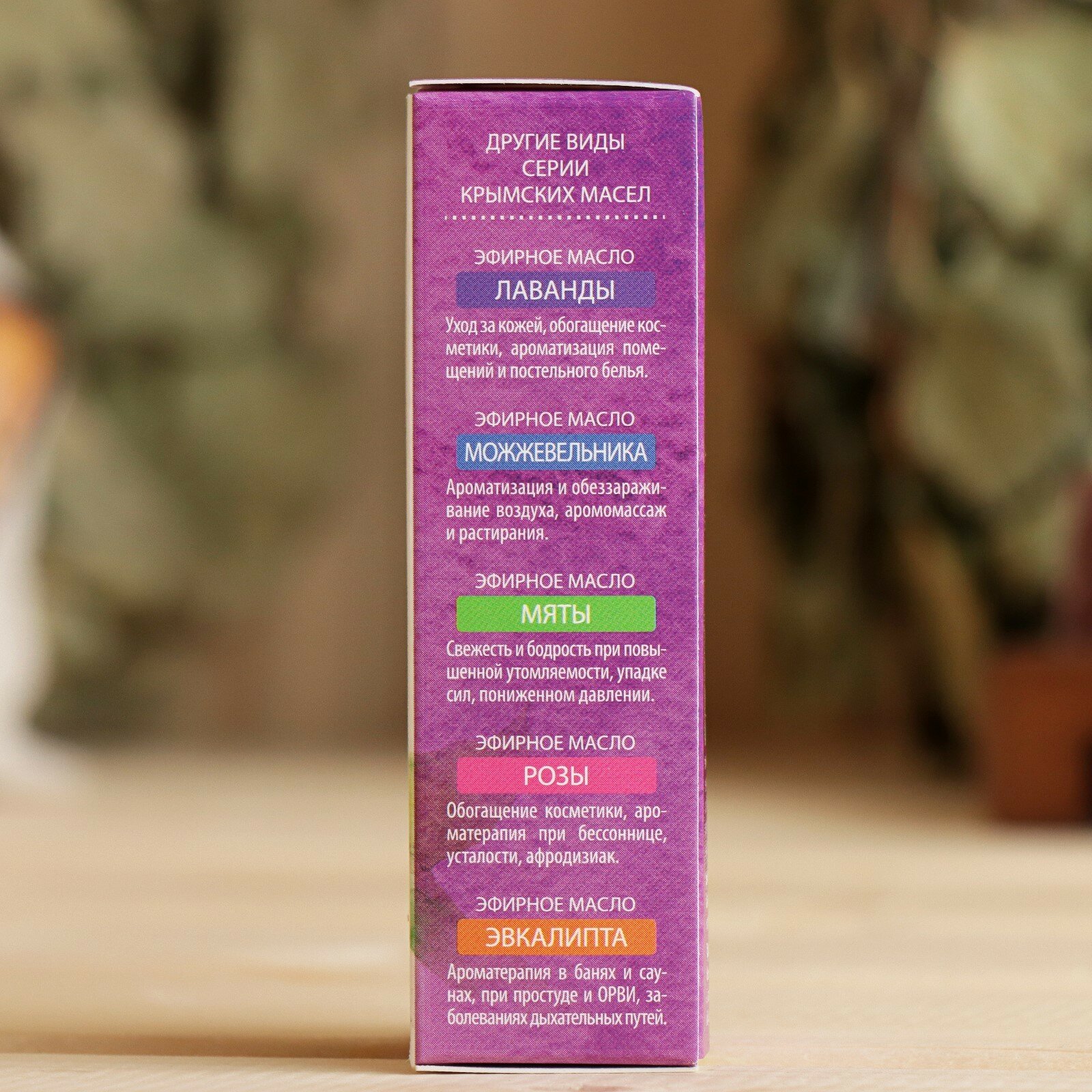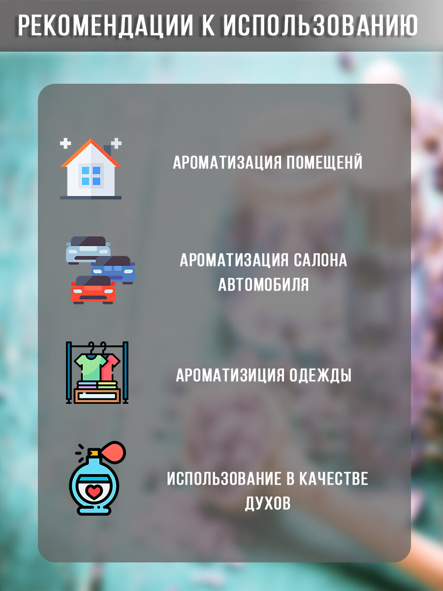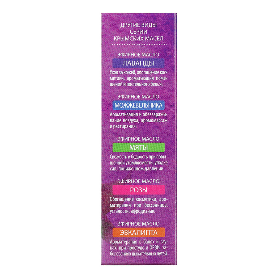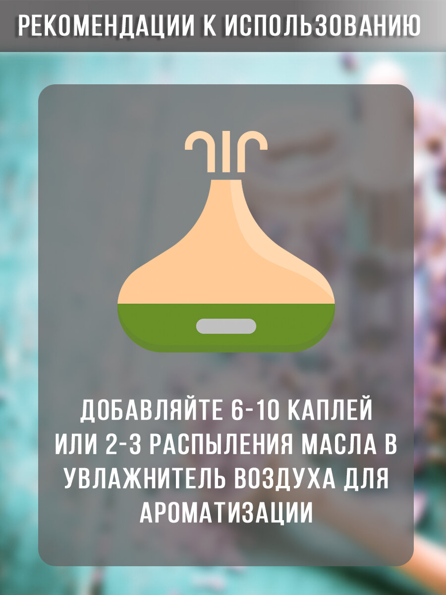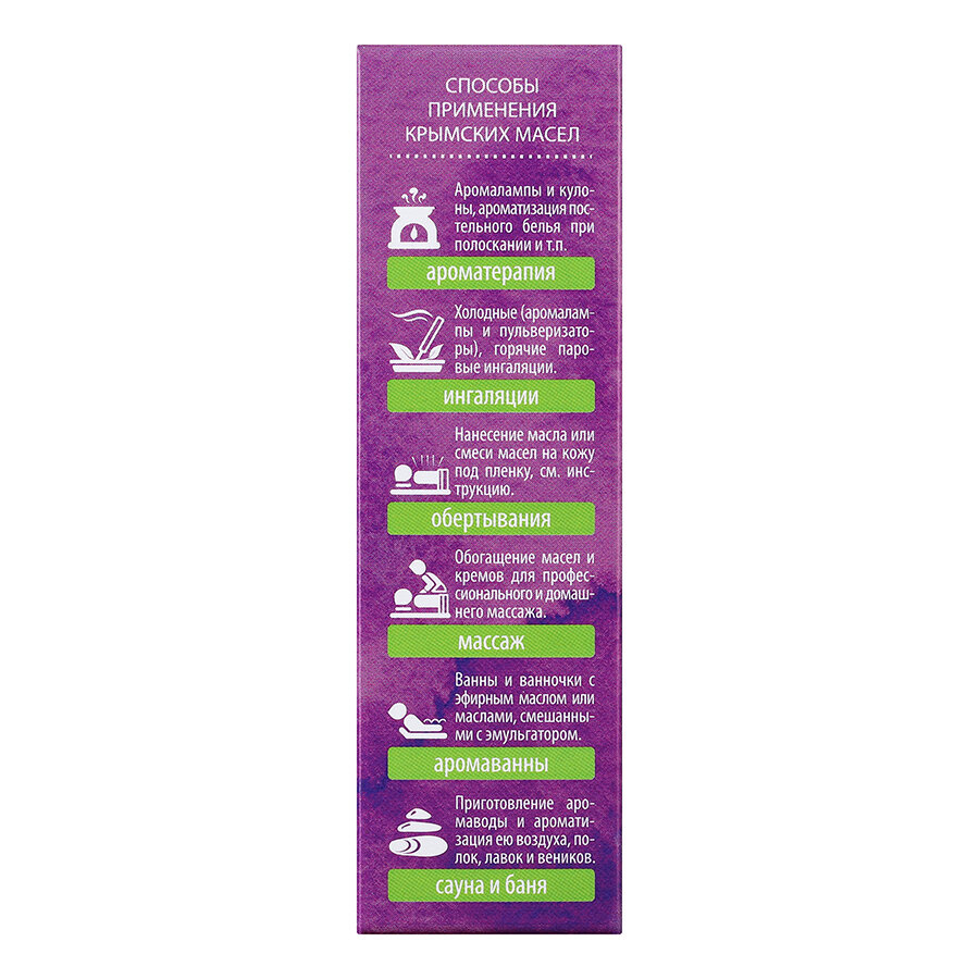 | Способ применения | Ароматерапия, ультразвуковой аромадиффузор, баня, ванна, косметика, массаж, компресс |