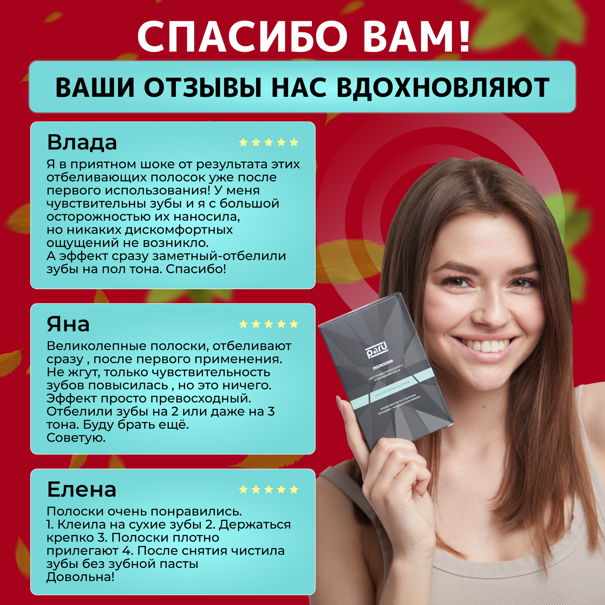 Ниже Вы можете прочитать отзывы на Отбеливающие полоски для зубов 7 шт курс отбеливание зубов PARU, ознакомится с подробными характеристиками, посмотреть интересные обзоры и фотографии на Отбеливающие полоски для зубов 7 шт курс отбеливание зубов PARU.