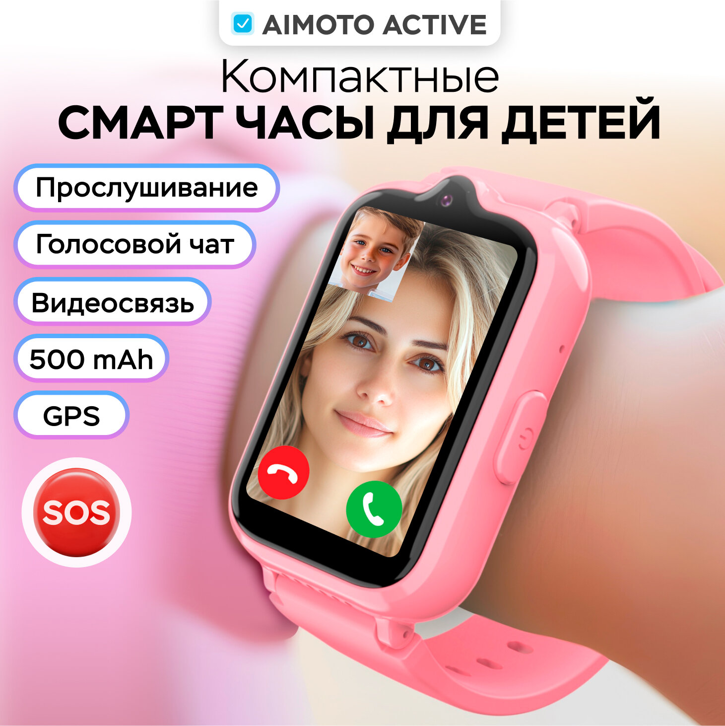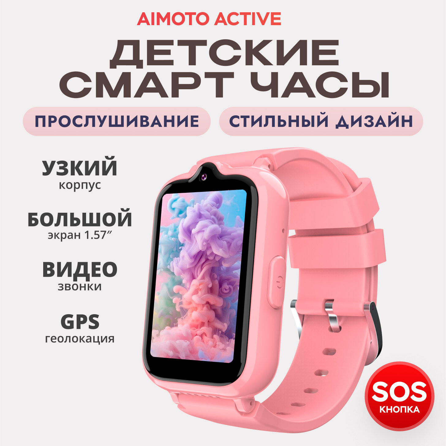 Cмарт часы детские умные c геолокацией и SOS, Aimoto ACTIVE PRO, Розовый