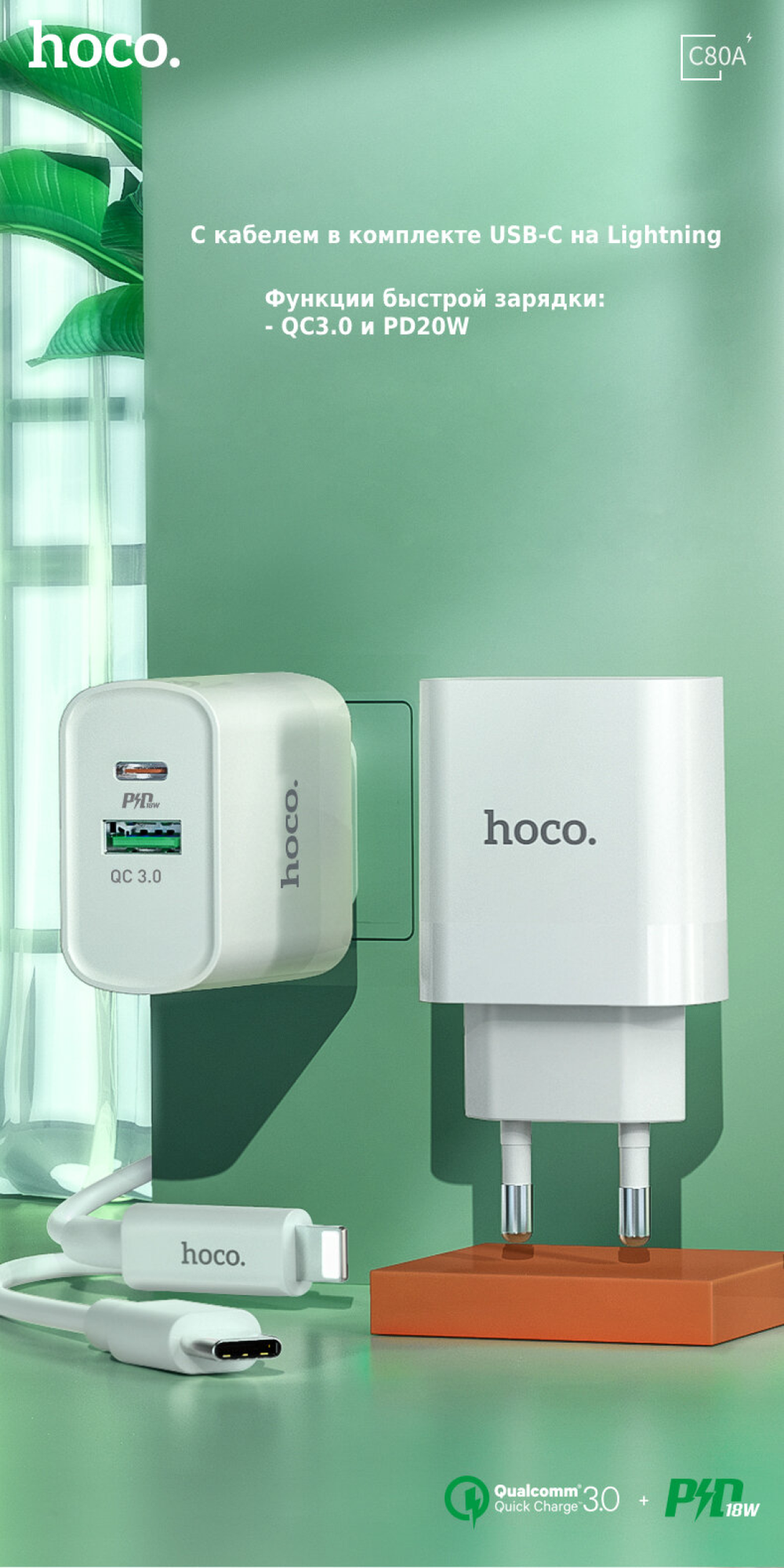 Сетевое зарядное устройство, 1 USB 3.0 QC+1 PD 20W (C80A), HOCO, Type-C to Lightning, белый интересное: