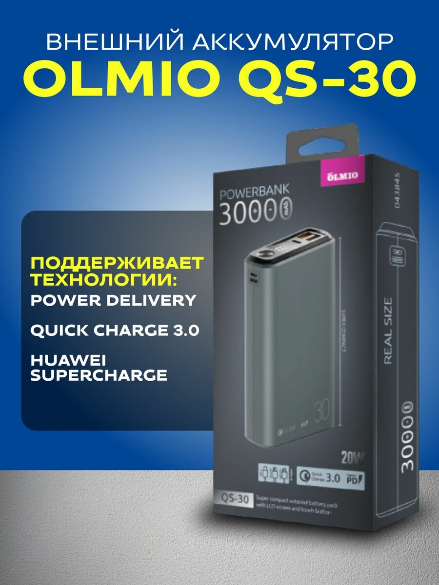 Внешний аккумулятор OLMIO QS-30, 30000 мАч, серый