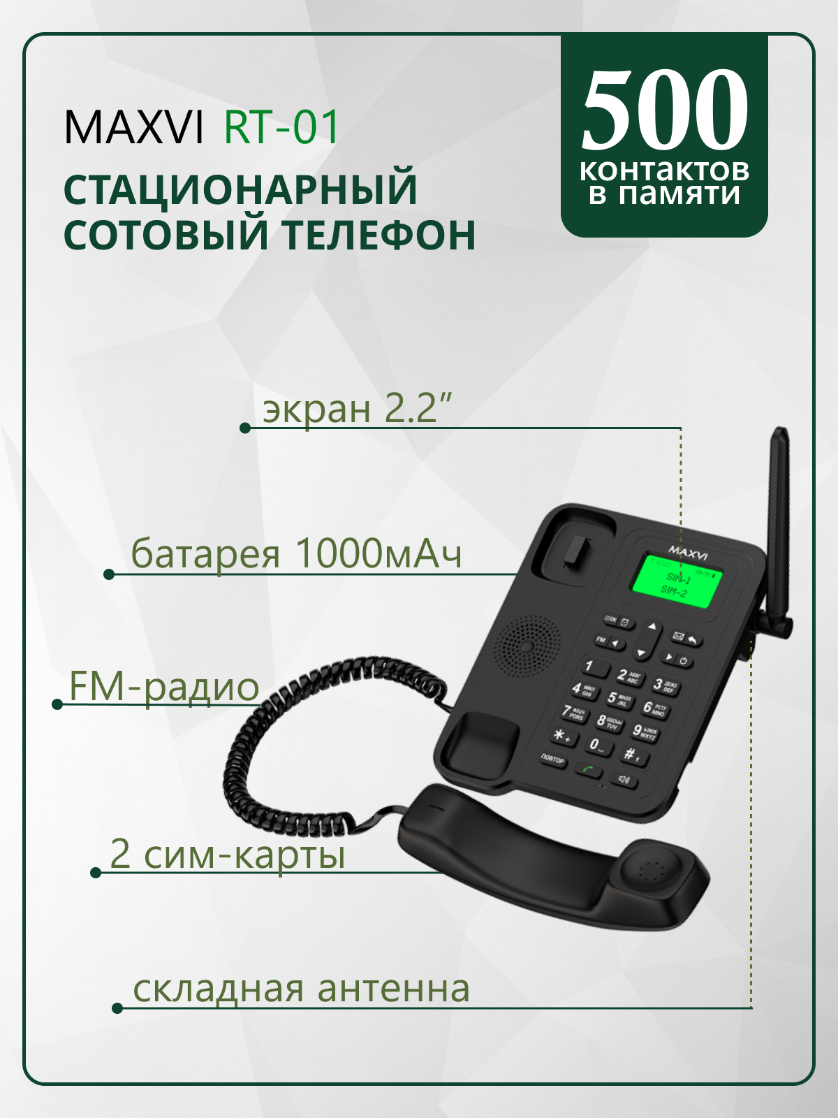 | Дополнительная информация | стационарный сотовый телефон для дома и офиса с поддержкой двух SIM-карт, аккумулятором 1000 мАч, внешней антенной и FM-радио. Телефонная книга Maxvi RT-01 рассчитана на хранение 500 контактов. |