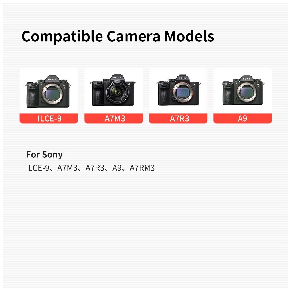 | Совместимость | Совместимые камеры: Sony a7R IIIA, a7R IVA, a7 IV, a1, a7C, a7S III, a6600, a9 II, a7 III, a7R III, a7R IV, a9 |