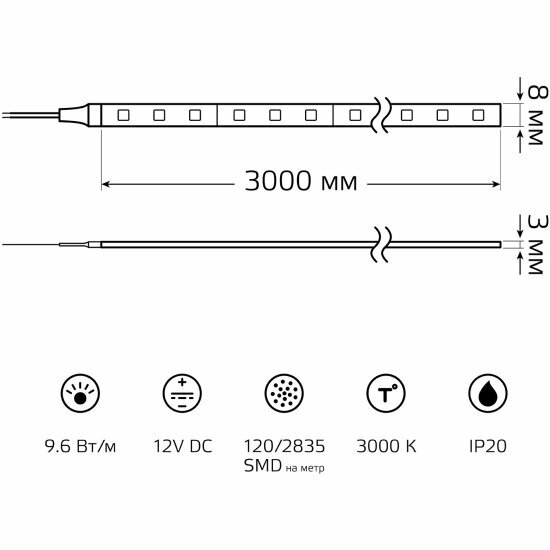 | Комплектация | Лента LED (3000К) Basic GAUSS тип 2835 DC 12В 9,6Вт 624лм/Вт 120led/м IP20 8 мм (бухта 3м) |