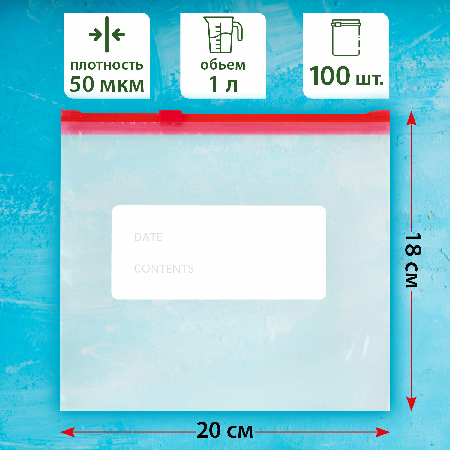 Пакеты для заморозки продуктов, 1 л, комплект 100 шт., с замком-застежкой (слайдер)