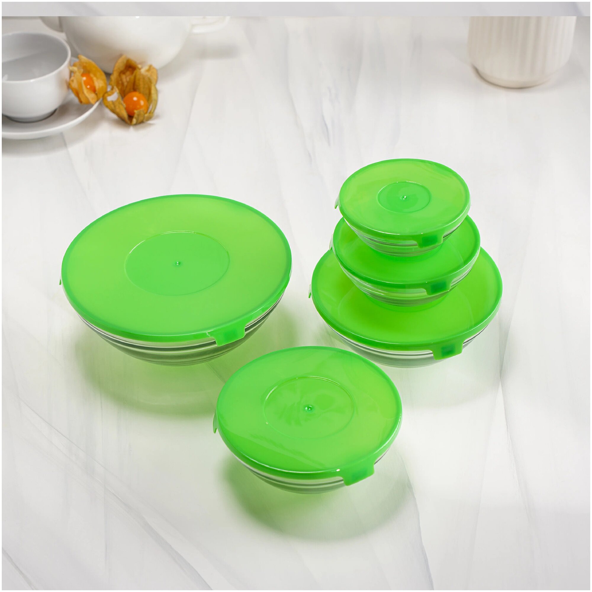 Набор салатников Доляна "Классика", с крышками, 5 шт: 900 мл (17*7,6 см), 500 мл (16*6 см), 350 мл (12,5*5,4 см), 200 мл (10,5*4,5 см), 130 мл (9*3,7 см), цвет зеленый